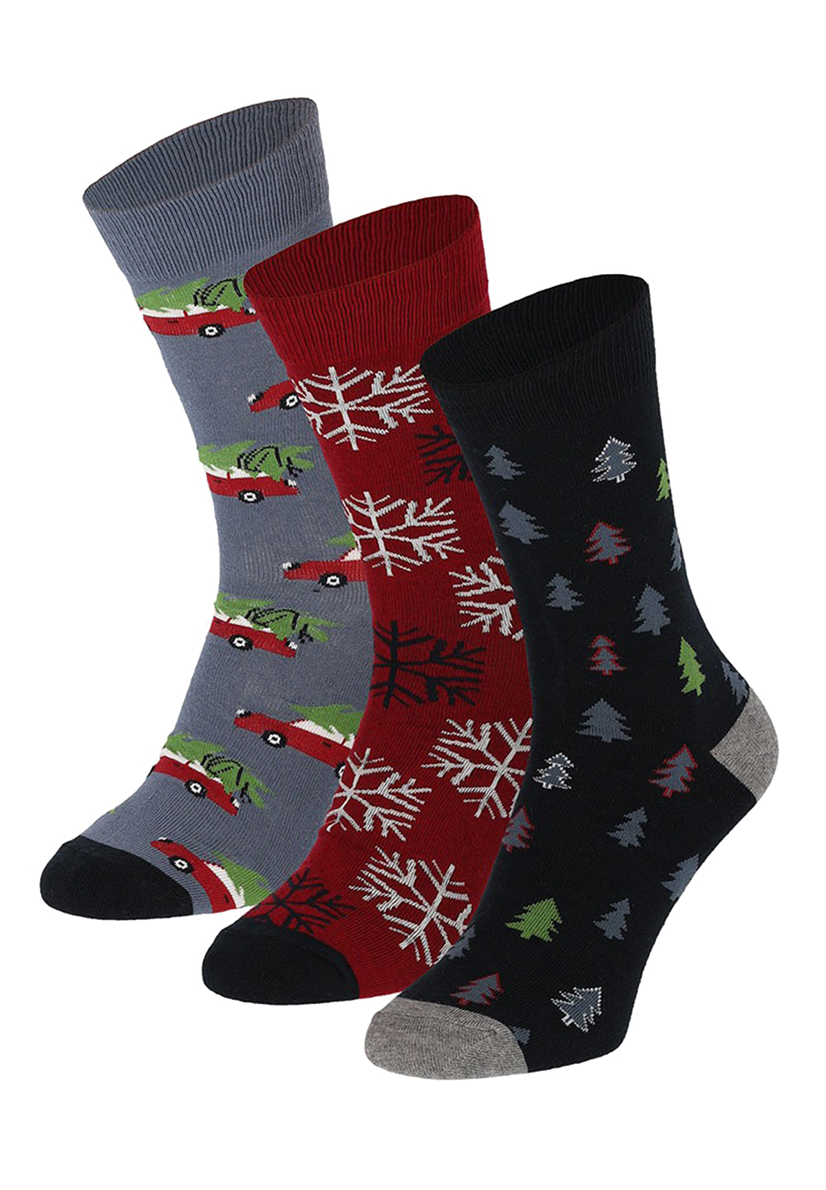 Apollo men's Christmas socks packaged in a 3-pair gift box. These casual men's socks have a subtle Christmas print, which means they will still match your outfit even after Christmas.