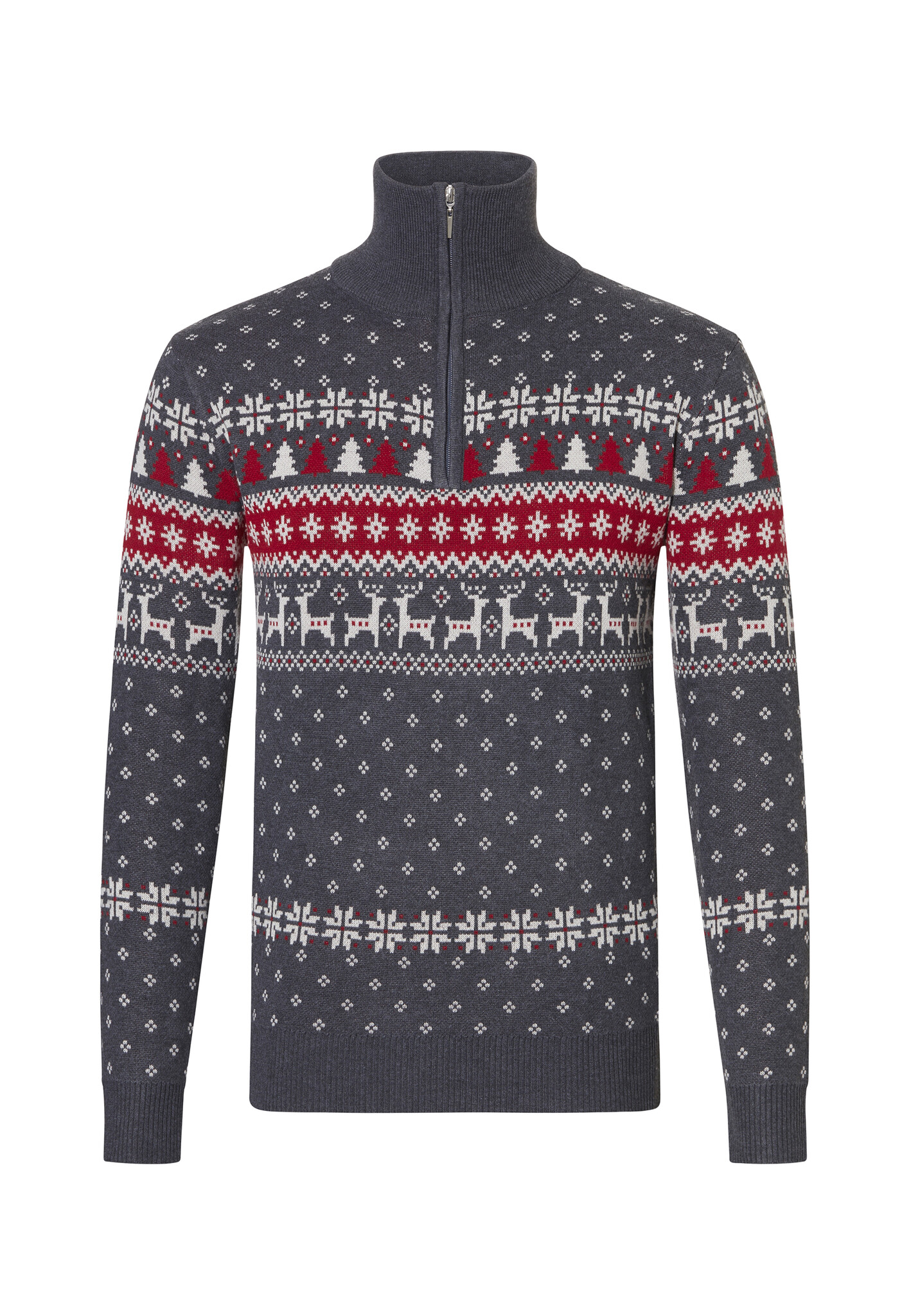This Christmas high collar sweater from Apollo combines a warm winter look with a playful Christmas print. The gray sweater features a comfortable zipper and a high collar that provides extra warmth during cold days, making it ideal for festive occasions as well as relaxed winter evenings.