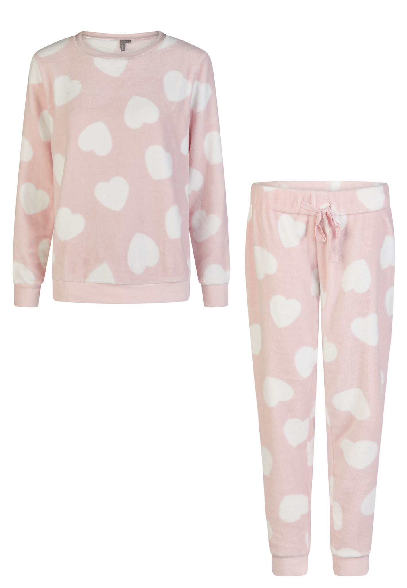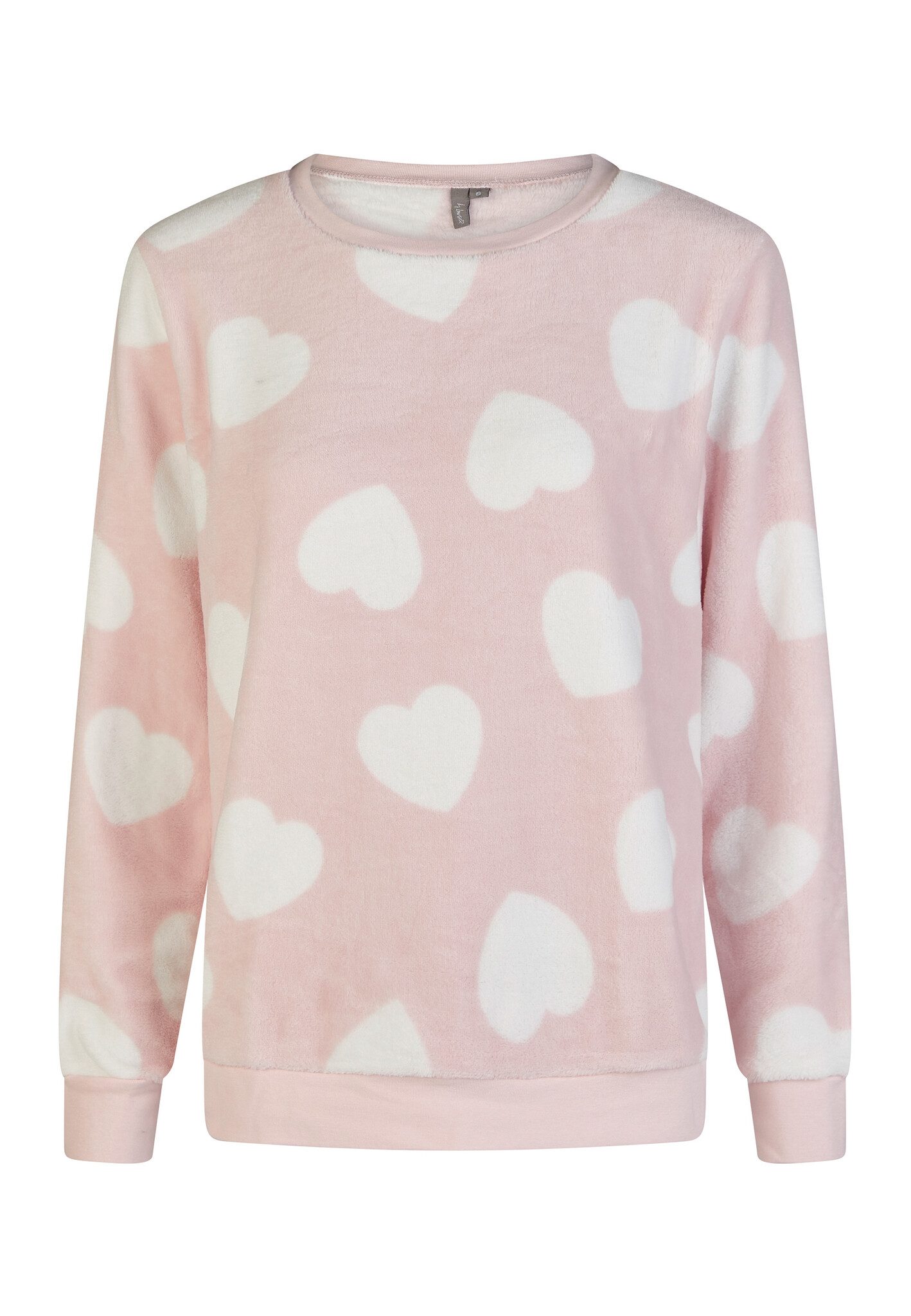 The pink women's heart print home suit from By Louise is the perfect choice for those who want to combine comfort and a touch of romance.This soft fleece set with sweater and lounge pants provides warmth and ease during your relaxing moments at home.