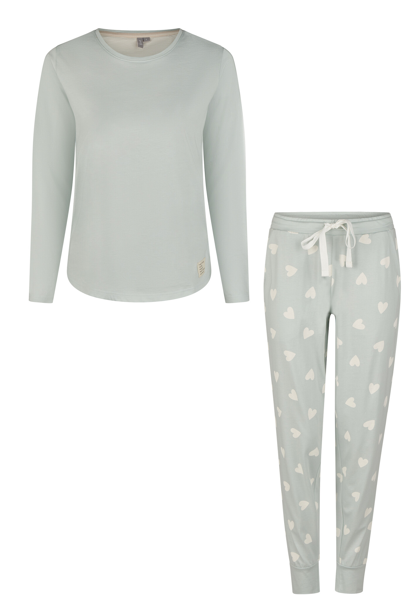 This women's pajama set from By Louise is the perfect choice for a relaxing night. The plain long-sleeved T-shirt with a round neckline exudes simplicity and style, executed entirely in a soft mint green color. The matching long pajama pants, also mint green, are decorated with a charming heart print for a playful and romantic look. Made of 100% cotton single jersey, this set offers light and breathable comfort.