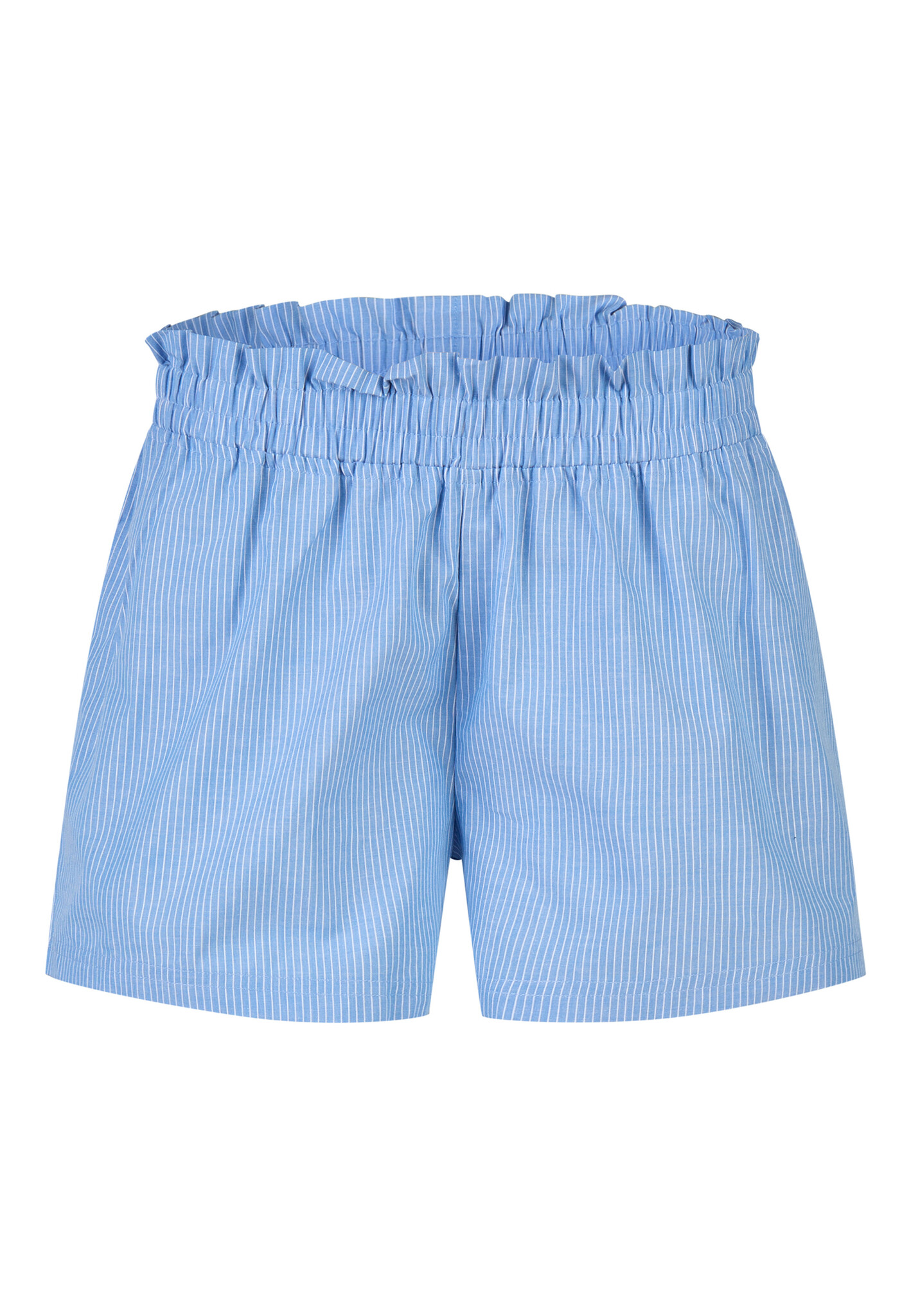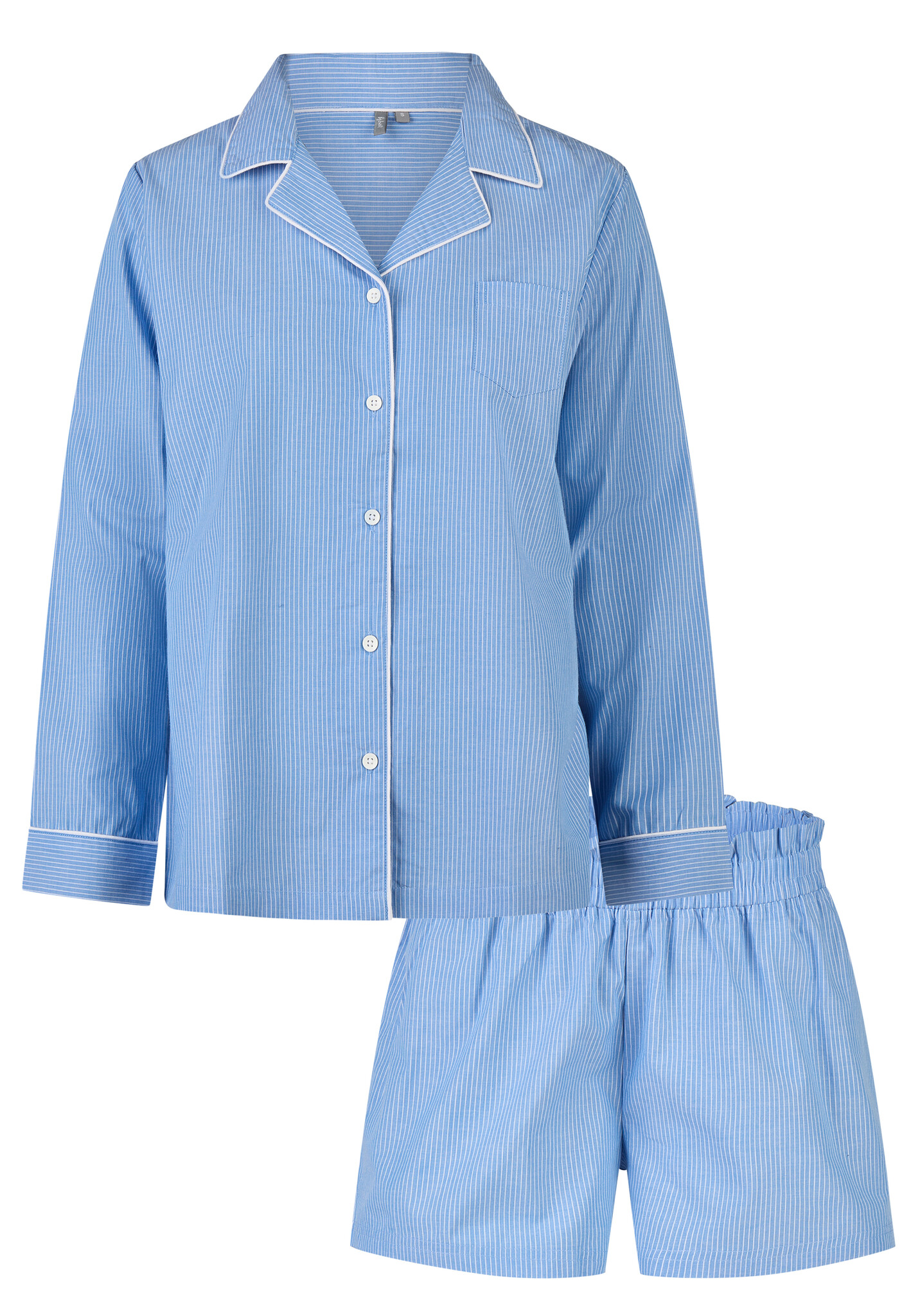 The women's pajama set from By Louise consists of a breezy long-sleeved blouse and shorts, perfect for those who love stylish comfort during warm nights. The pajamas are made of 100% woven cotton and have a classic look with the collar, button closure and chest pocket. The blue and white stripe design gives the set a fresh, timeless look.