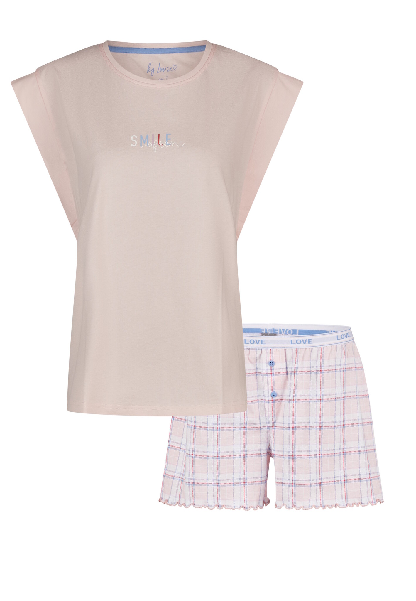 Fresh into the night with By Louise's short pajama set - breezy, feminine and made of 100% cotton.This short pajama consists of a plain pink short-sleeved top and pink plaid shorts. Perfect for warm nights or relaxed lounging on weekends.