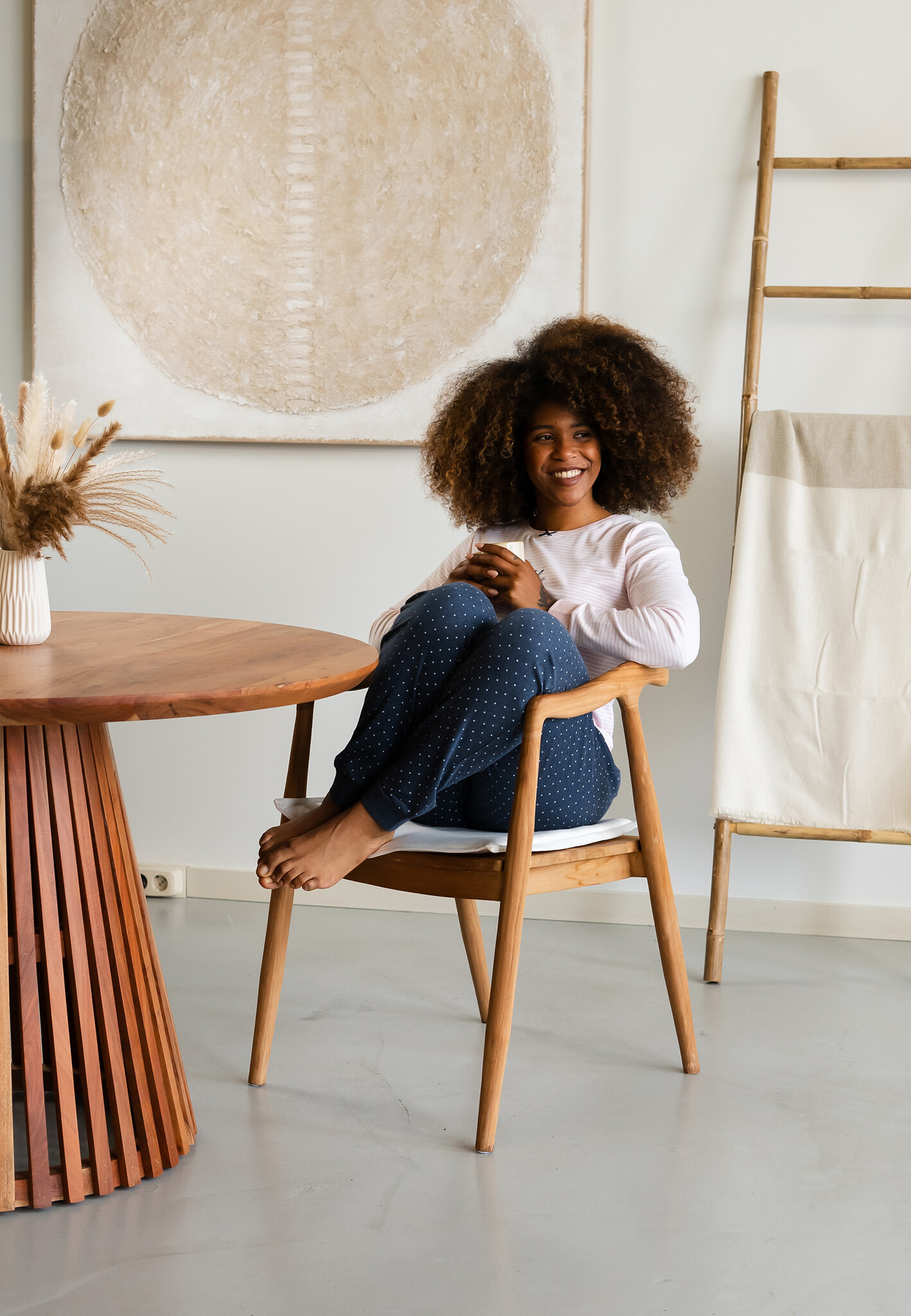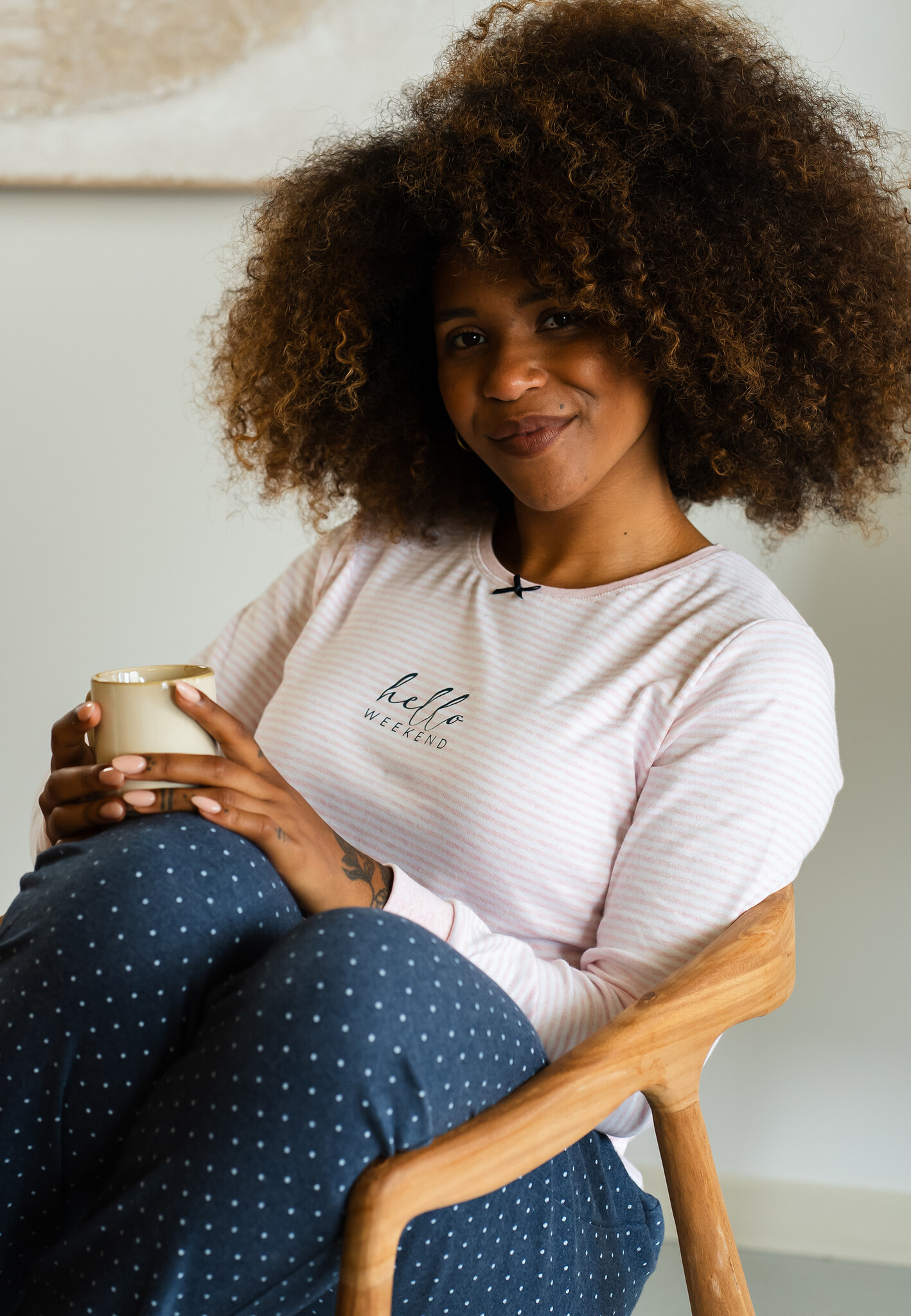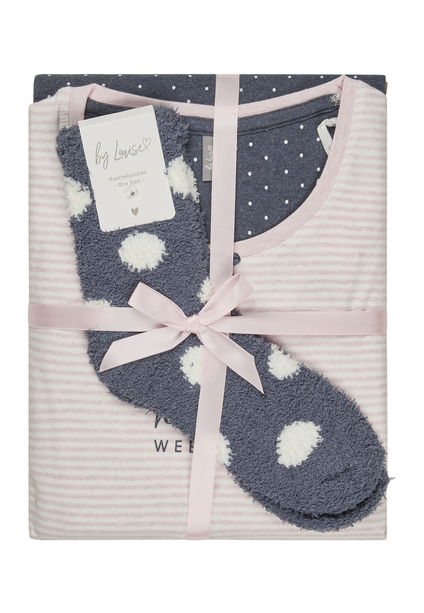 The By Louise women's pajama set is perfect for a cozy evening lounging on the couch. This winter pajama set includes long pajama pants and a long-sleeved shirt, made from a warm cotton blend. The set is completed with soft terry house socks, ideal for keeping your feet nice and warm.