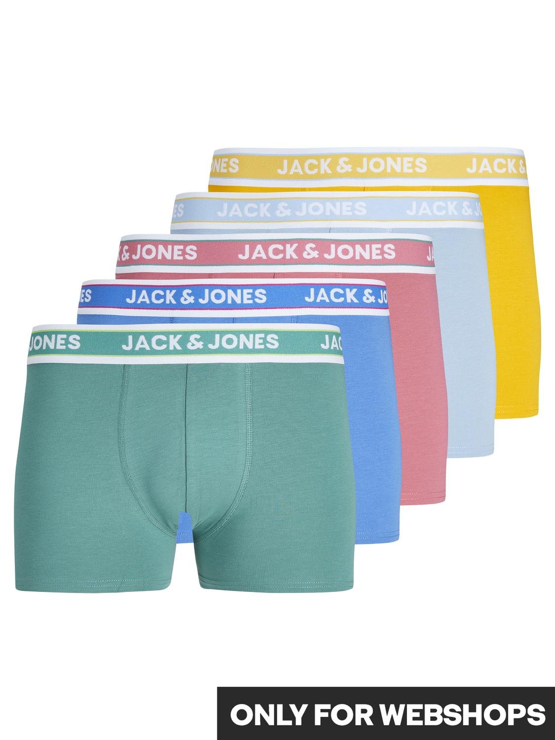 Jack & Jones boxer shorts for men. The set of underpants includes 5 underpants in solid colors green, blue, pink, light blue and yellow with elastic waistbands and short leg. In addition, the elastic waistband features the Jack & Jones logo. The Jersey knit fabric is lightweight and stretchy for extra comfort. Made of 95% cotton and 5% elastane.