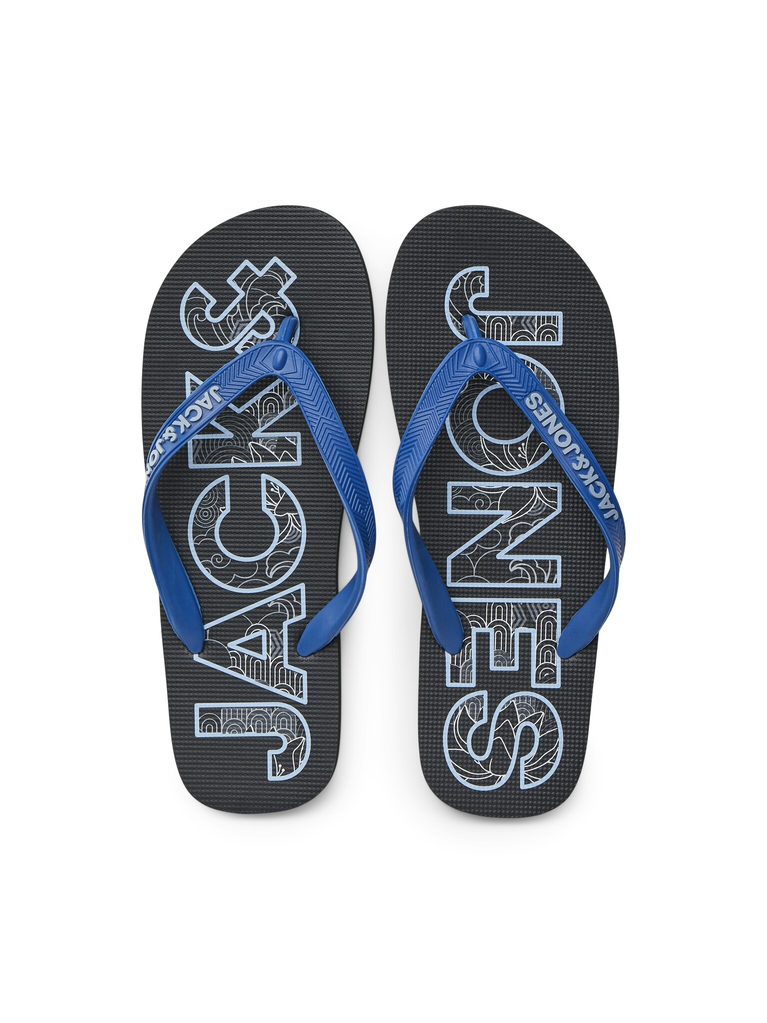 Jack & Jones men's open-toed sandals. Ideal for the hot summer days. The sandals have a logo print on the footbed with cool pattern. Furthermore there is a small logo print at the toe closure and the flip flops are made of 100% PU rubber.