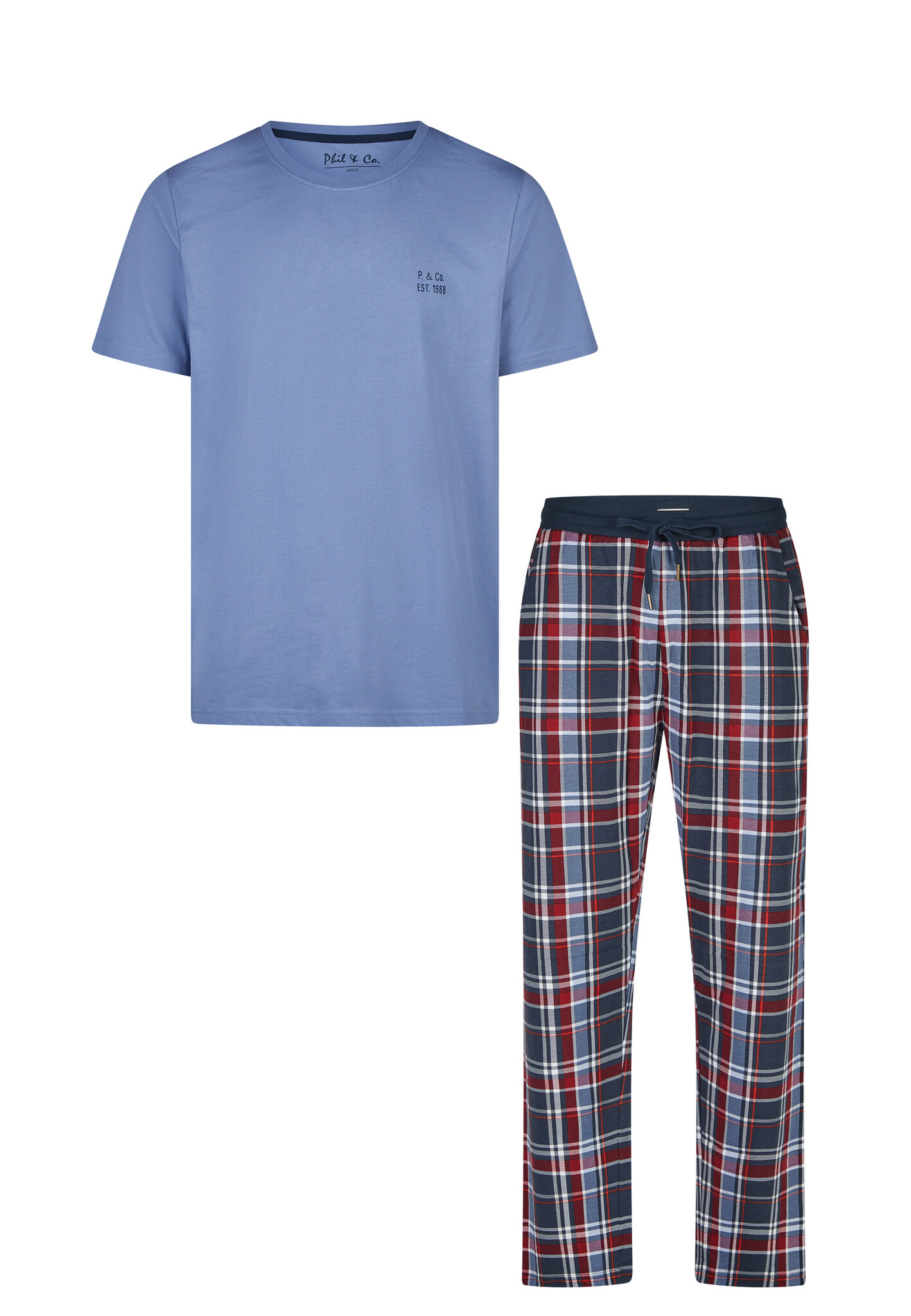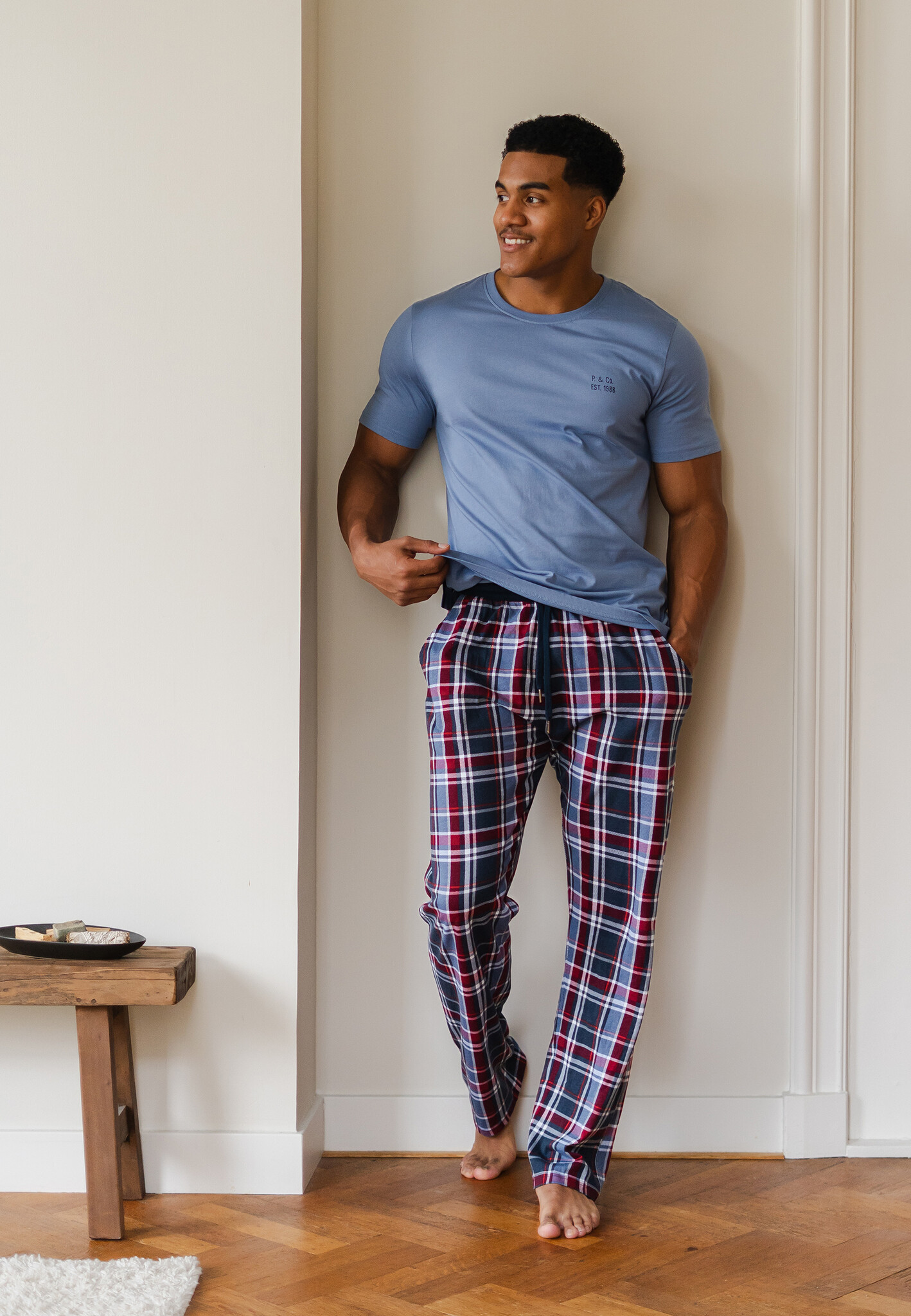 The Phil & Co Essential men's short sleeve blue/red pajama set is a comfortable set for relaxing evenings and restful nights. The short sleeve t shirt feels comfortable on the skin and the plaid long pants give the pajamas a classic look. This pajama set is comfortable while sleeping but also when you are still starting up in the morning.