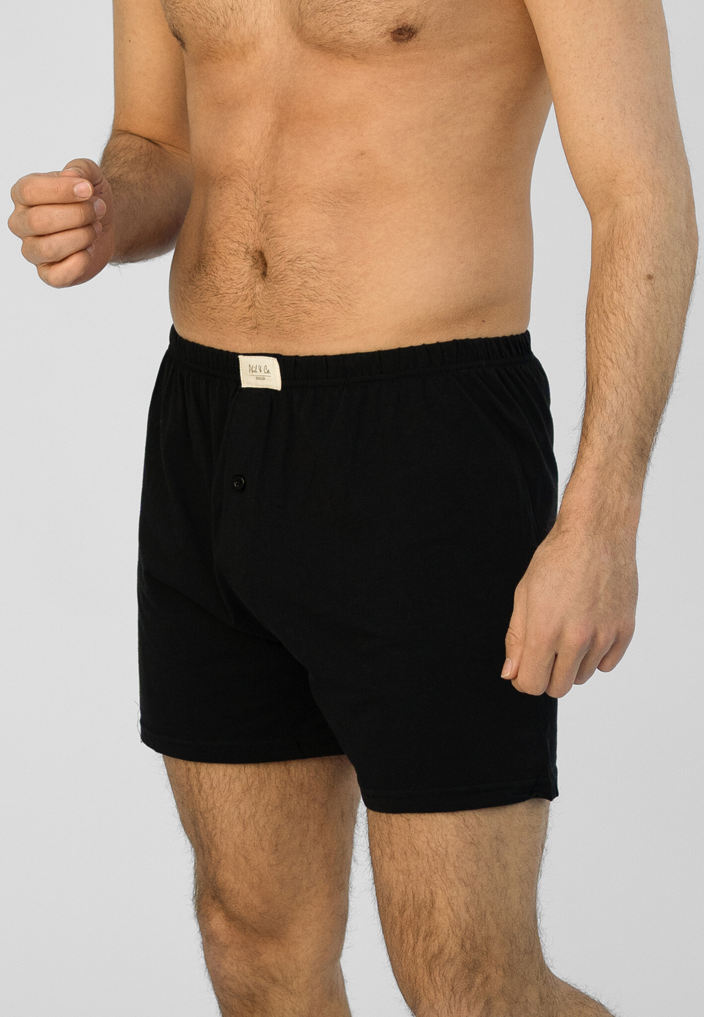 Phil & Co boxer shorts in soft jersey. Comfortable wide boxer shorts made of 100% cotton. The shorts are loose and wide. The highly elastic but soft waistband provides little pressure and is comfortable to wear, with button closure at the fly. This multipack contains 3 plain black and 3 blue boxer shorts.