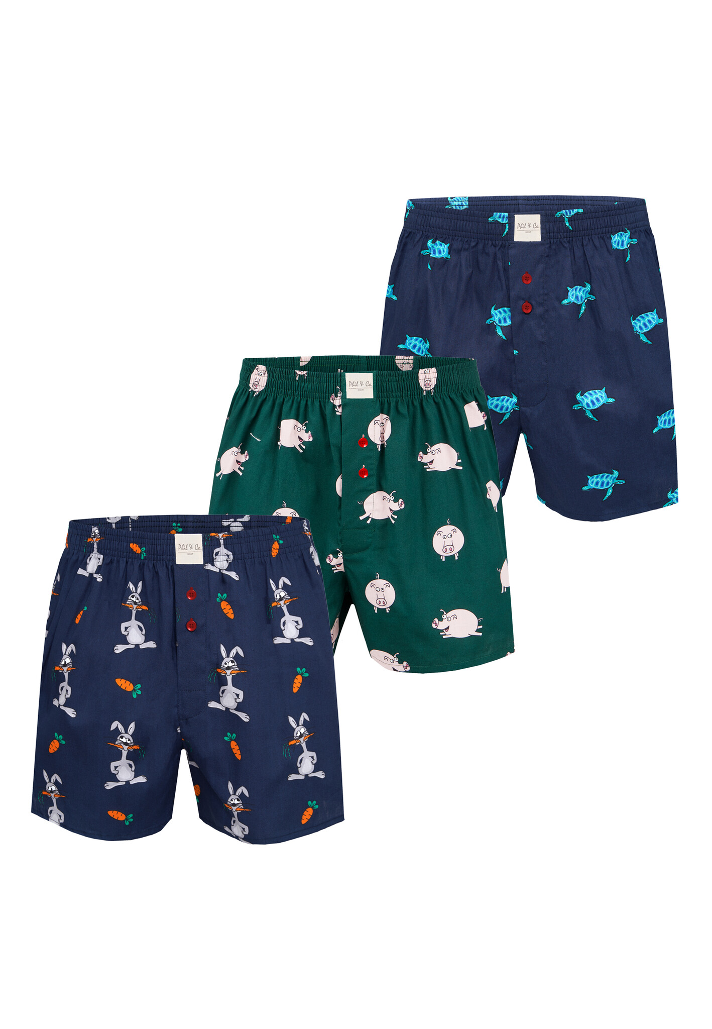 Each boxer brief is printed with a unique, playful print: rabbits with carrots, happy little pigs and laid-back turtles.