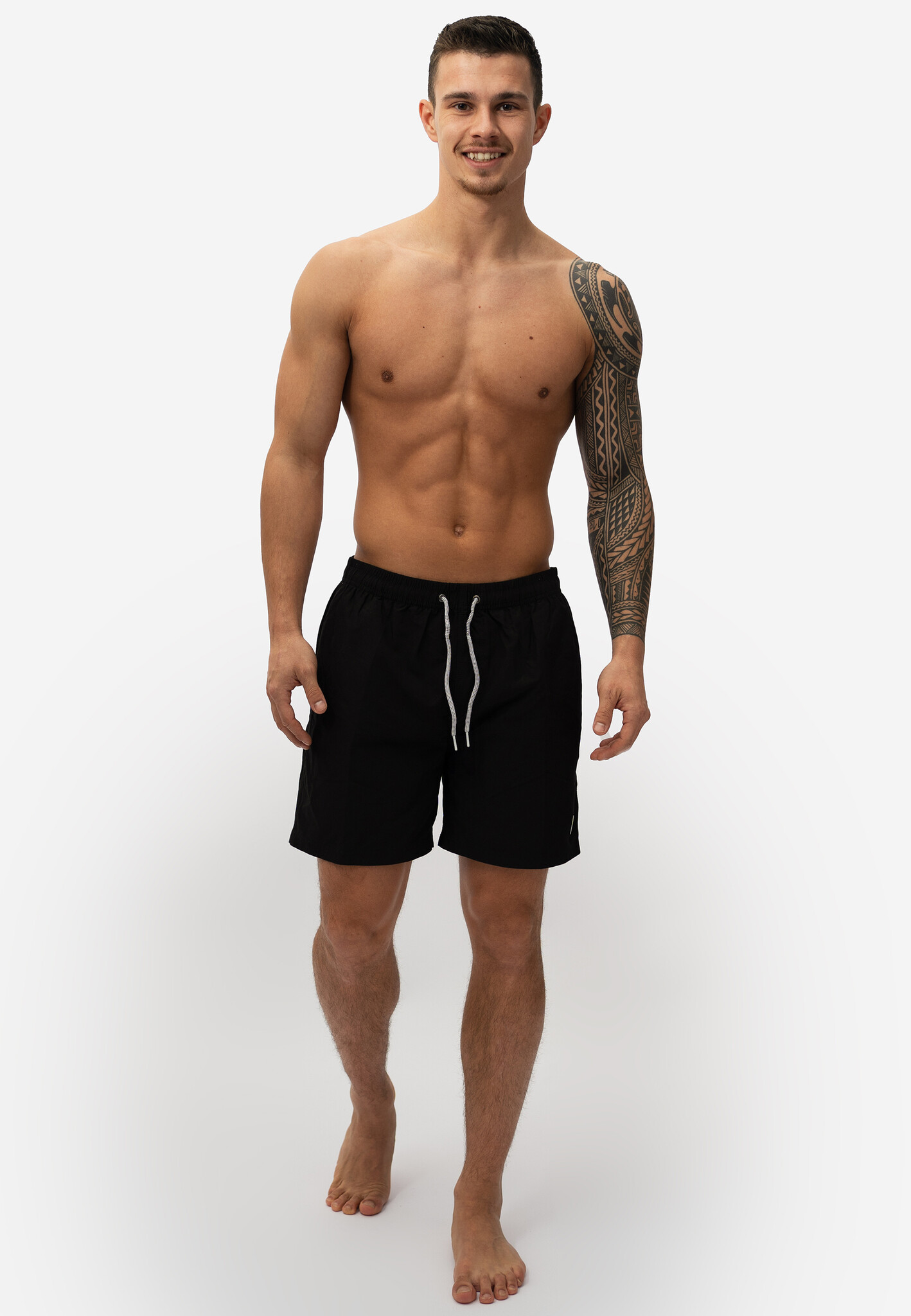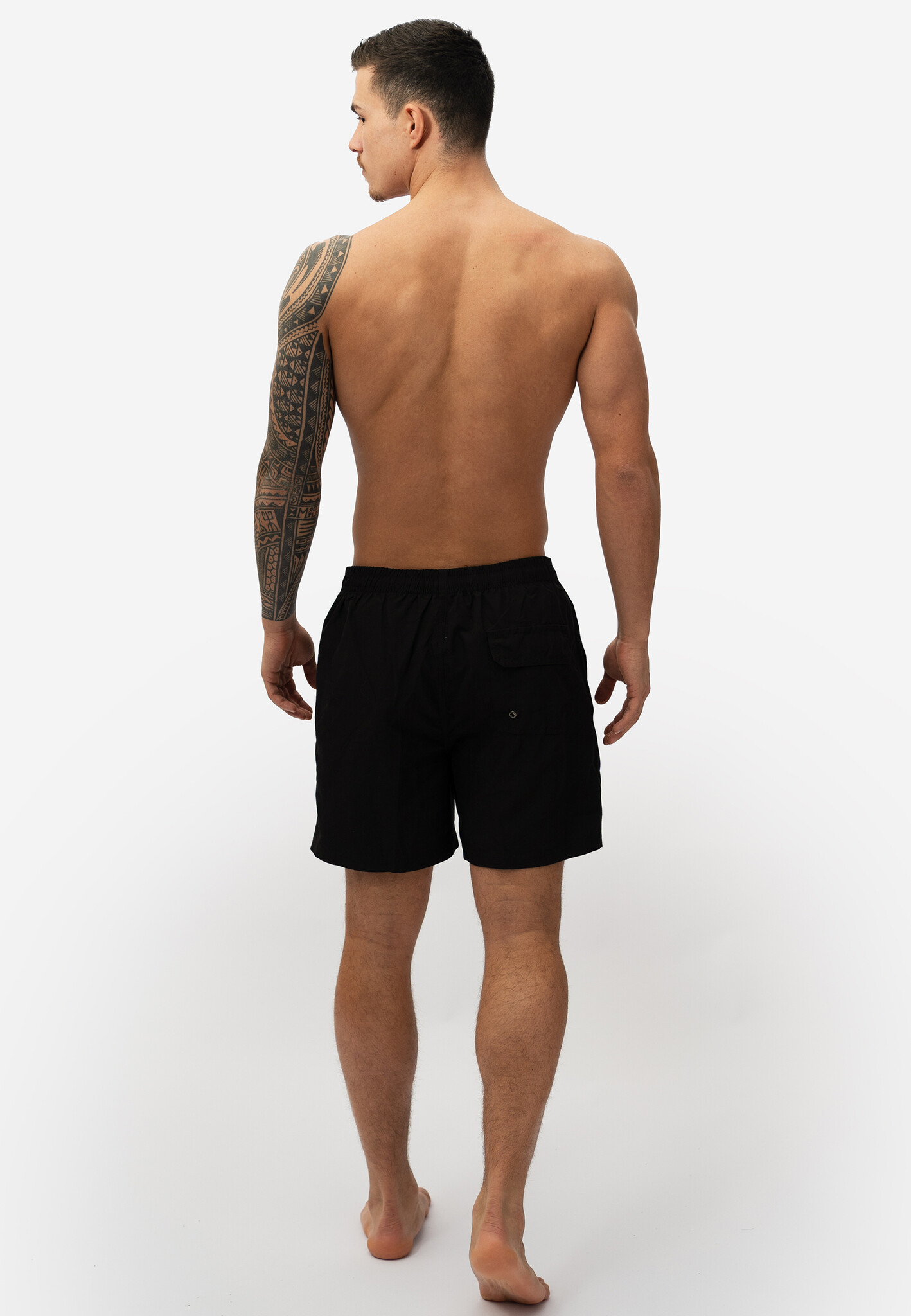 Phil & Co polyester swim shorts in solid black. The swimsuit has 2 side pockets and 1 back pocket with Velcro closure, mesh inner pants for extra comfort.