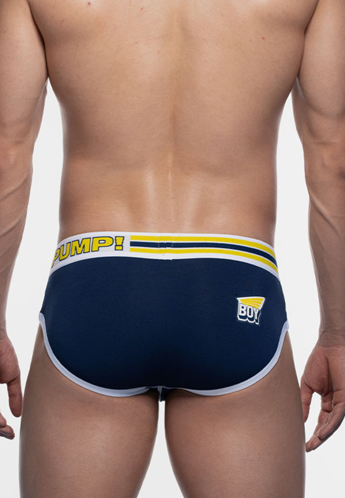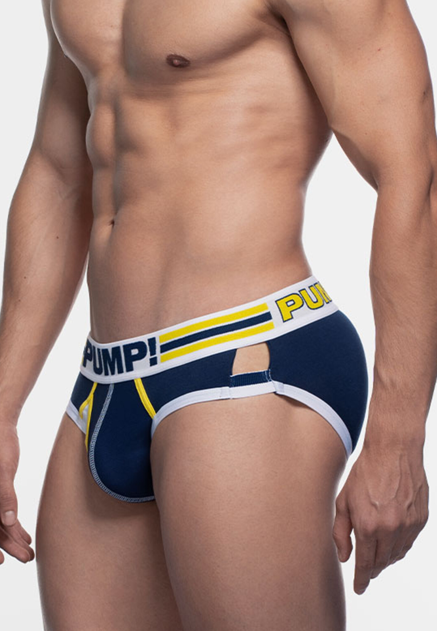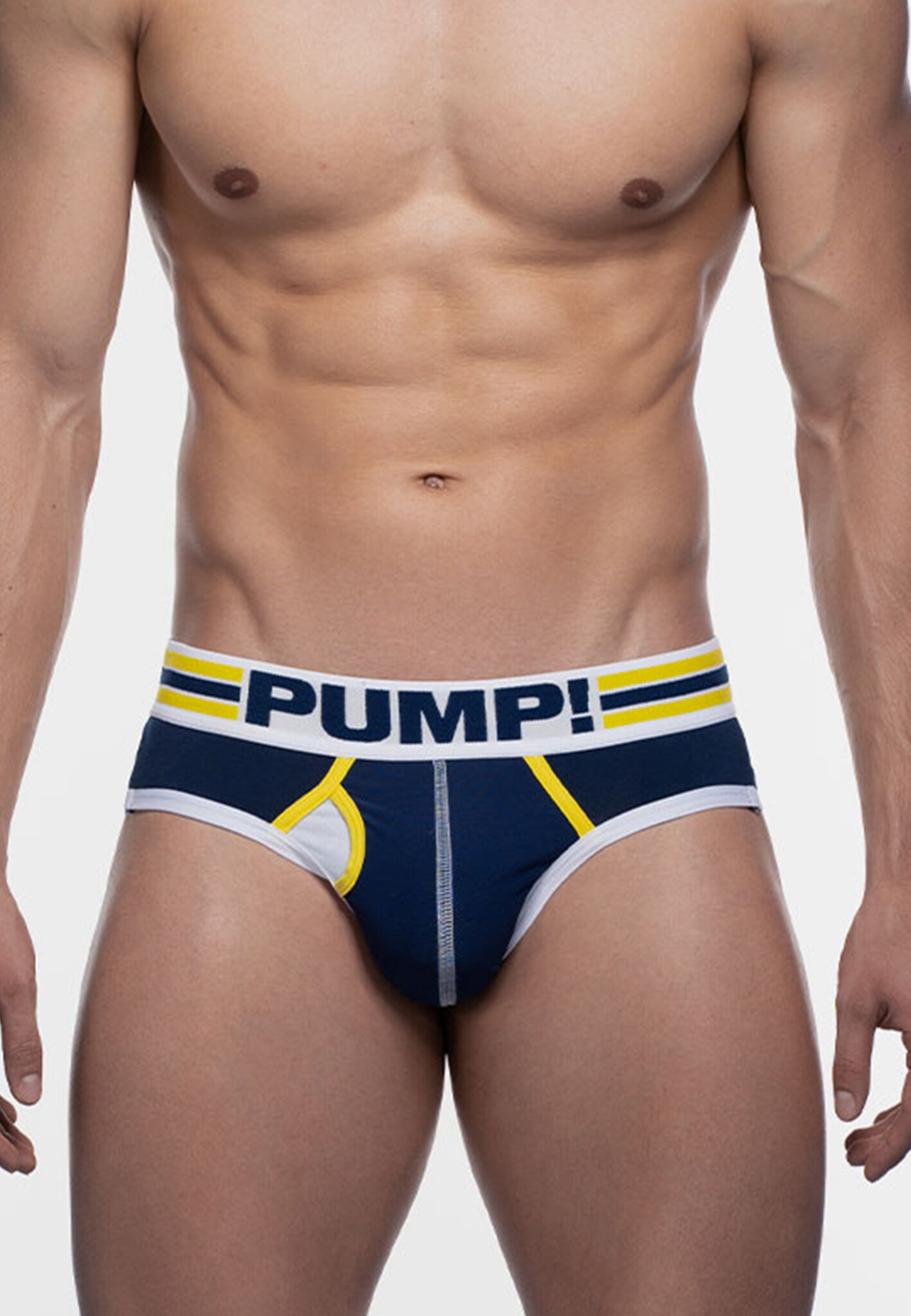 The SideCut Brief from PUMP! features a 45mm wide waistband in navy blue, white and yellow, finished with a navy logo for a sleek, sporty look.