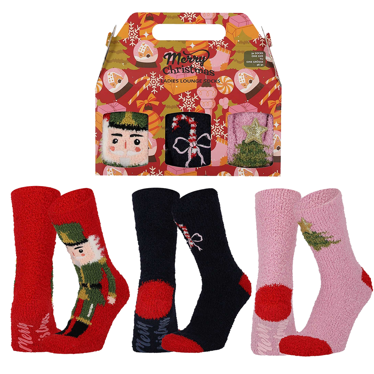 Apollo Dames Sokken Kerst Print Chenille Bedsokken Giftbox 3-Pack
