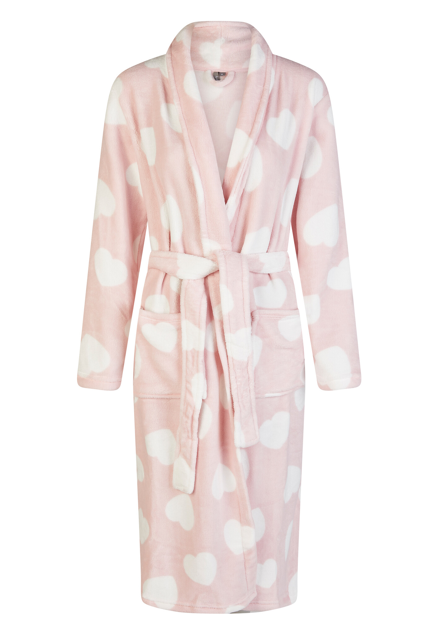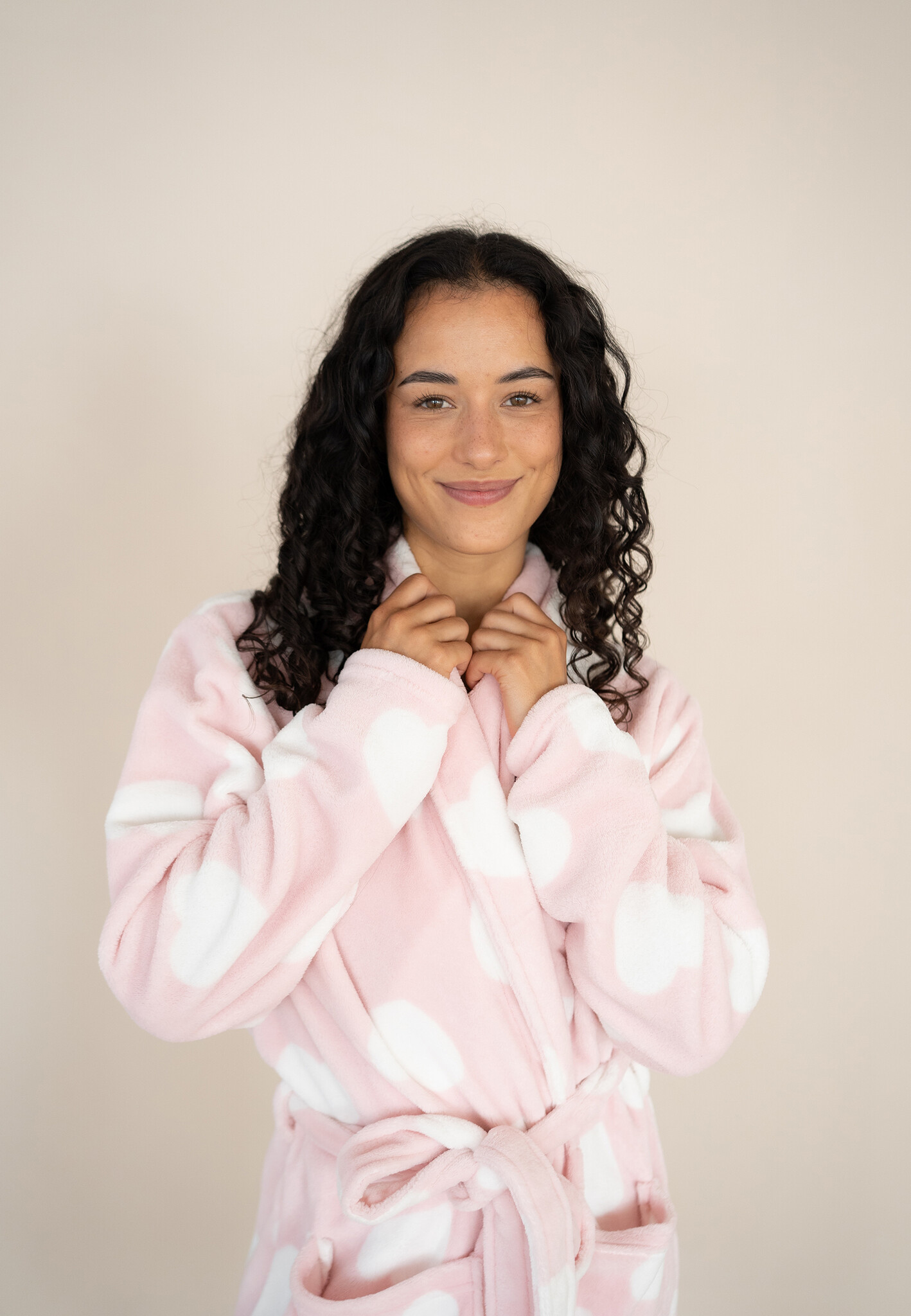 De roze badjas van By Louise met hartjesprint is een zachte, vrouwelijke must-have voor relaxte momenten thuis. Gemaakt van knuffelzacht fleece en afgewerkt met een taillekoord, biedt deze ochtendjas comfort en een speelse uitstraling in één.
