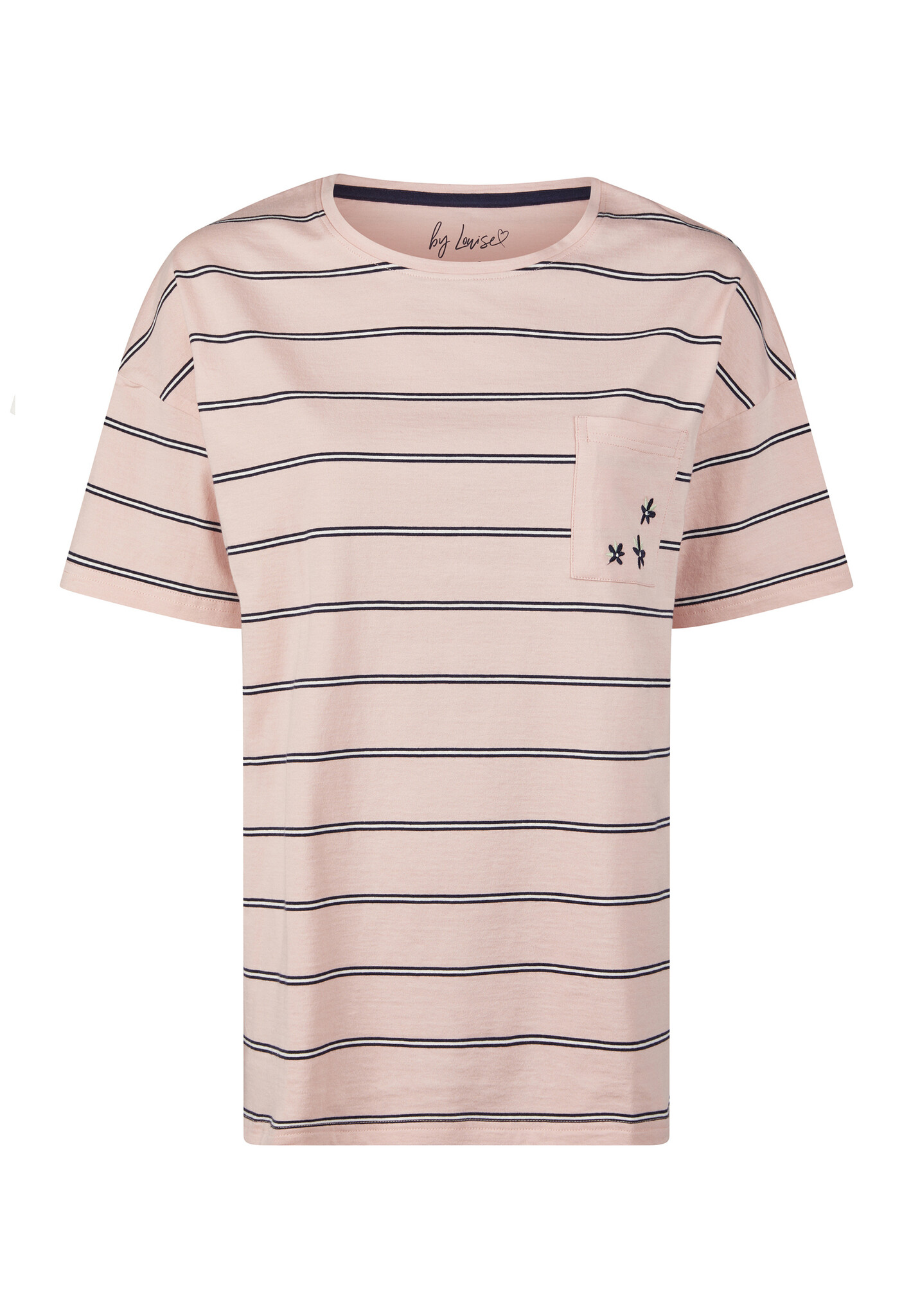De damespyjama van By Louise is een luchtige shortama set van 100% katoen. De set bestaat uit een t-shirt met ronde hals, korte mouwen en een bijpassend kort broekje. Dankzij de ruim vallende mouwen en zachte single jersey stof zit deze zomerpyjama comfortabel en licht. Perfect voor warme nachten of ontspannen ochtenden.