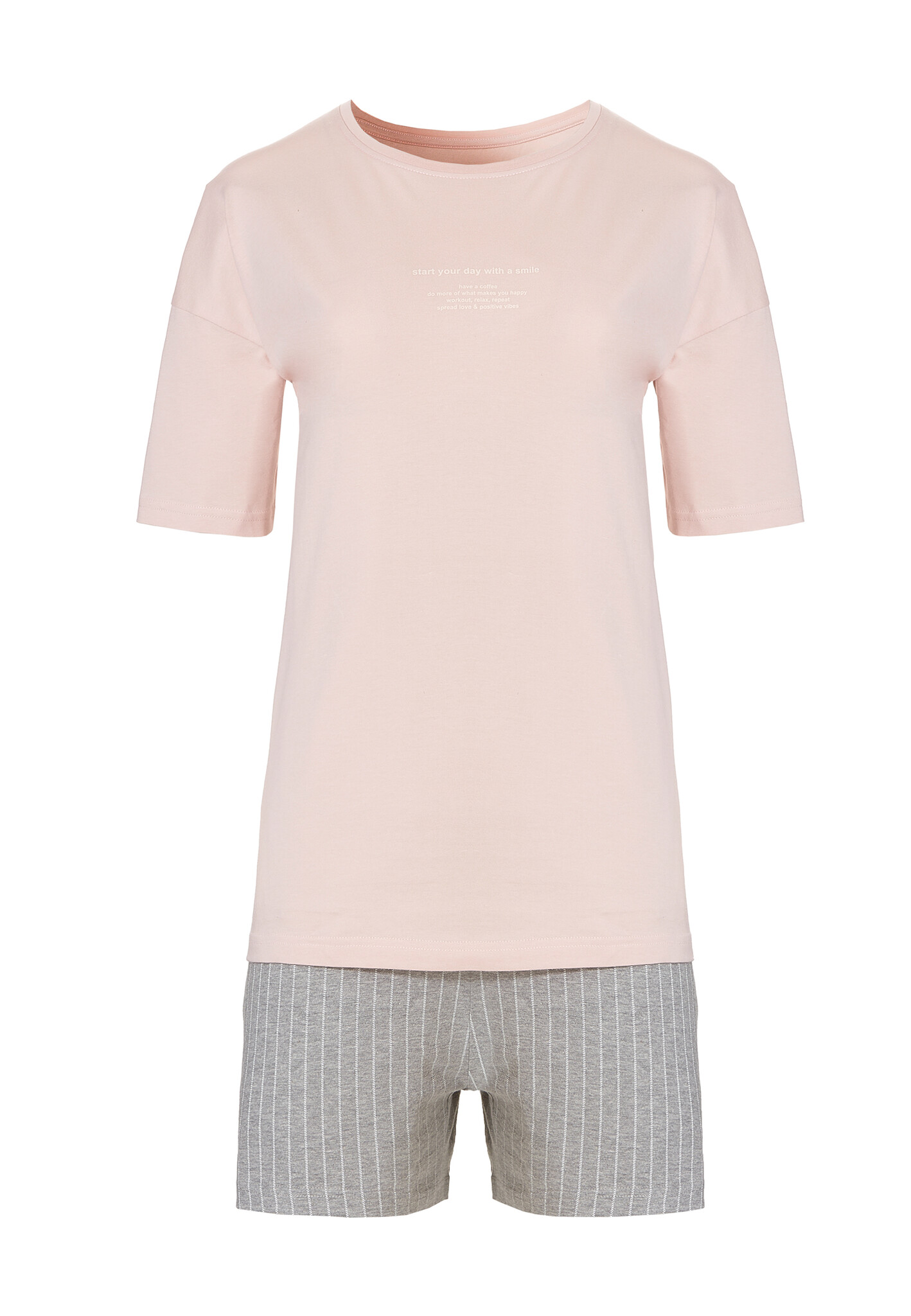 By Louise dames korte pyjama sets shortama met korte mouwen en ronde hals. Het roze shirt is gemaakt van 100% katoen. De korte grijze broek heeft een gestreept patroon en is gemaakt van 88% katoen en 12% polyester.
