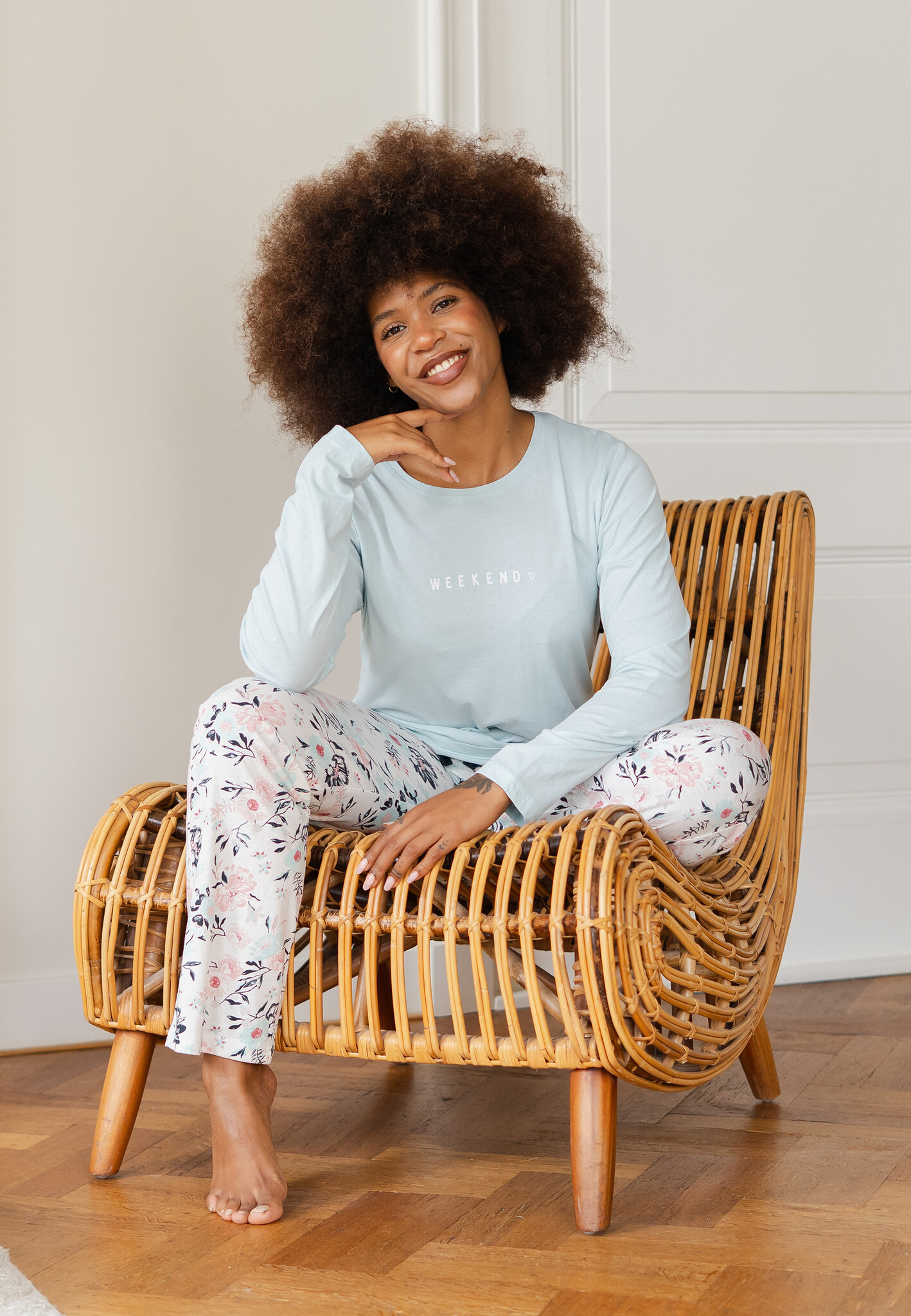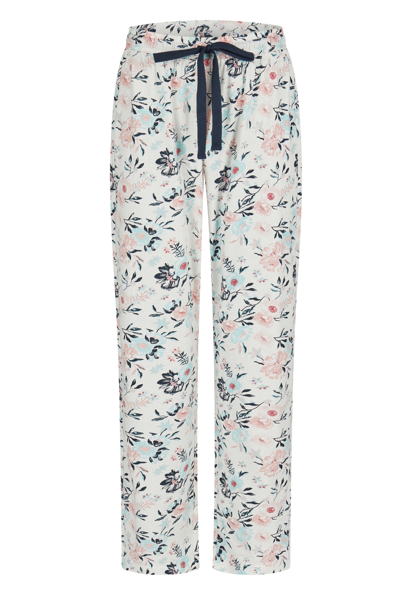 - Bijzondere kenmerken: trekkoordsluiting in de taille en een stijlvolle combinatie van een blauw shirt met een blauw gebloemde broek