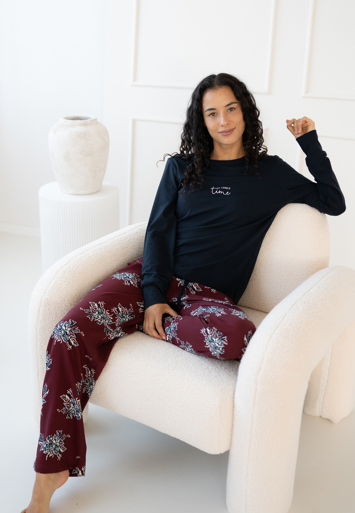 Deze stijlvolle dames pyjama set combineert een donkerblauw shirt met een bordeaux rode broek met bloemenprint, ideaal voor wie comfort en een elegante look wil samenbrengen. De mix van modal, katoen en viscose zorgt voor een zachte, soepel vallende set die perfect is voor ontspannen avonden en comfortabele nachten.