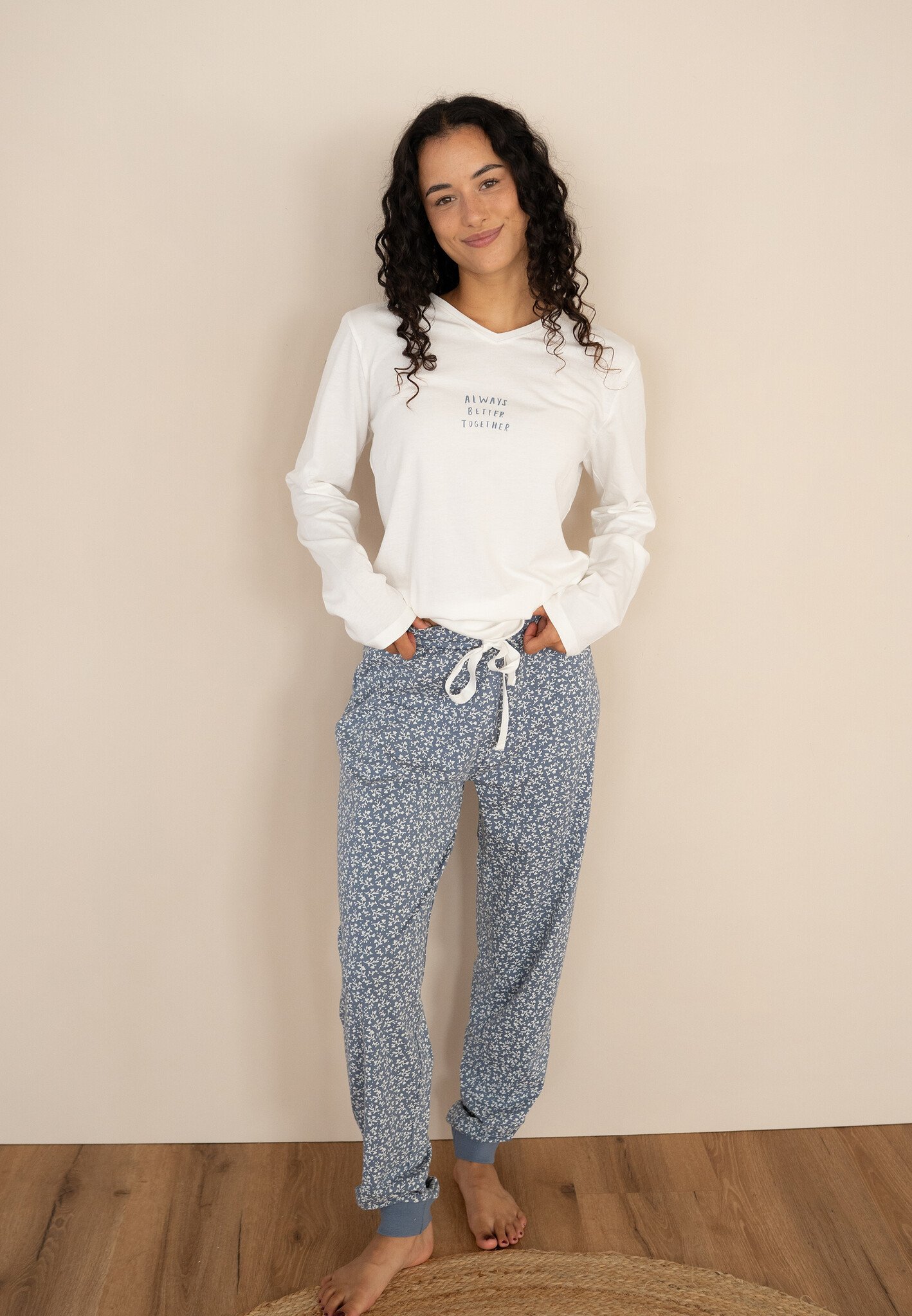 By Louise Dames Pyjama Set Lang V-Hals Off-White/Donkerblauw Gebloemd