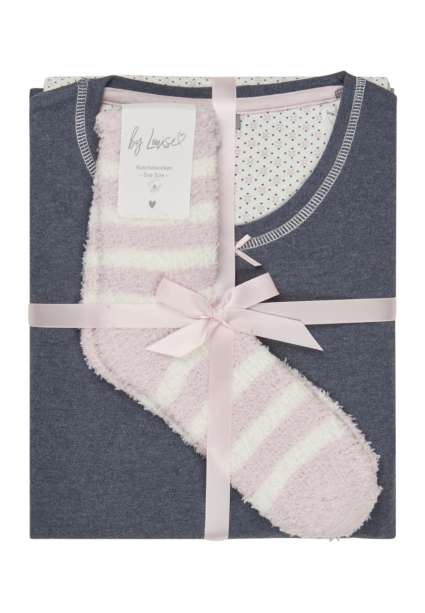 De By Louise dames pyjama set is perfect voor een gezellige avond loungen op de bank. Deze winterpyjama set bestaat uit een lange pyjamabroek en een shirt met lange mouwen, gemaakt van een warme katoenmix. Het setje wordt compleet gemaakt met zachte badstof huissokken, ideaal om je voeten lekker warm te houden.