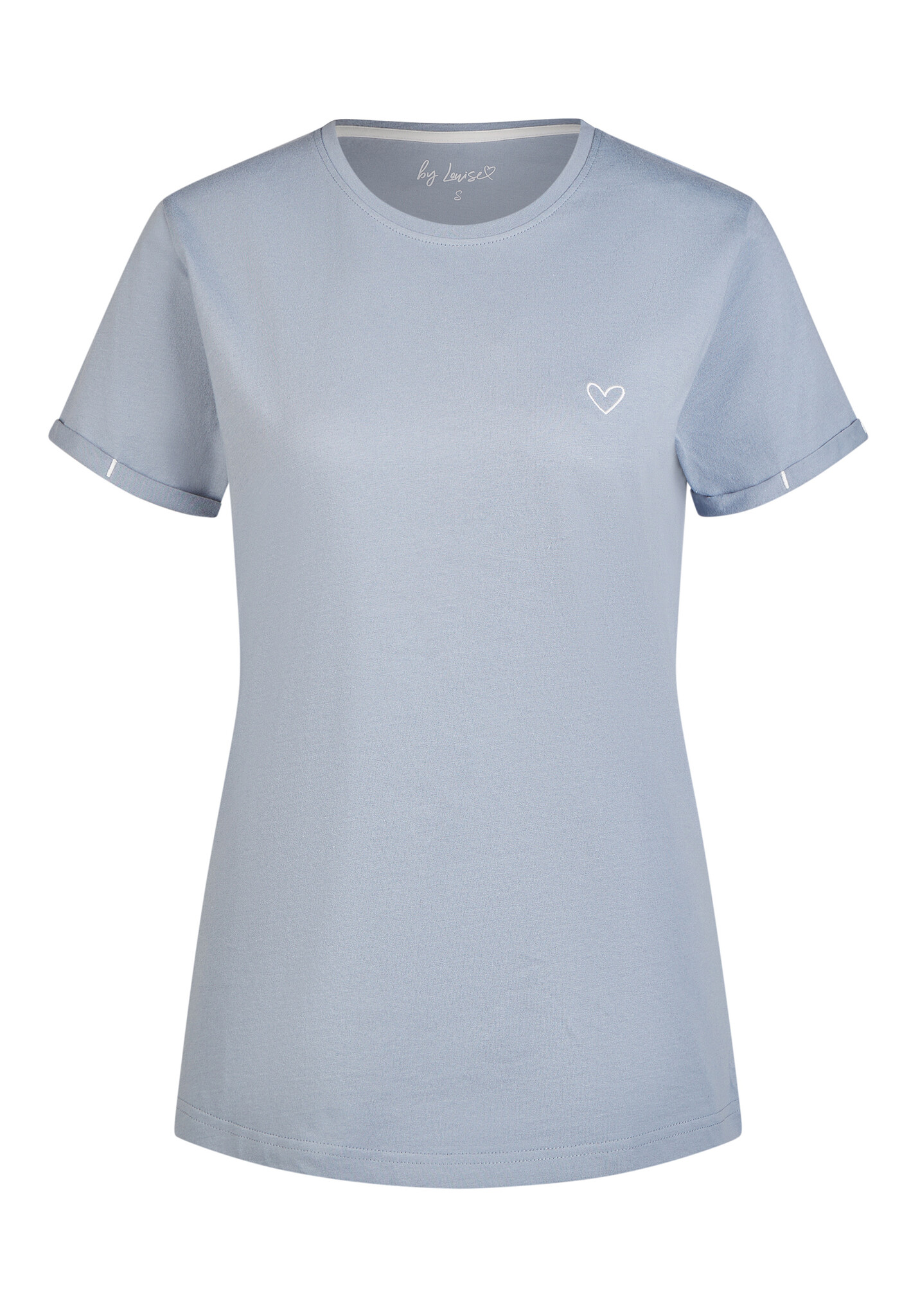 - Het shirt heeft een effen lichtblauwe kleur met een hartjesdetail op de borst