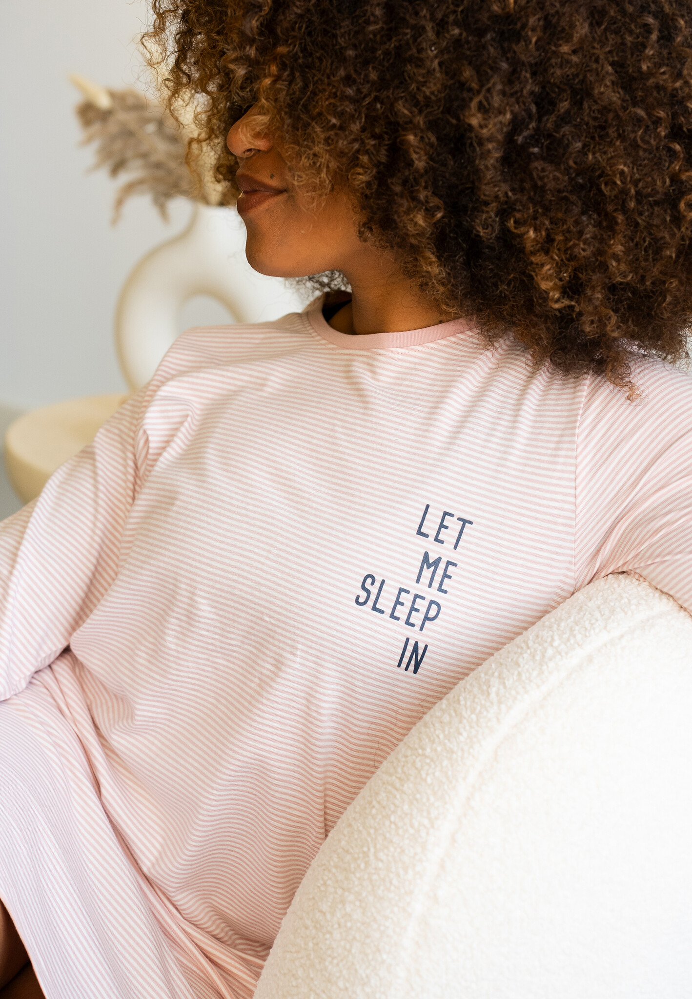 By Louise dames nachthemd van 100% Jersey katoen. Het gestreepte nachthemd met tekst "Let me sleep in" heeft een ronde hals en lange mouwen. Een big shirt is heerlijk om in te slapen of in te loungen op een luie zondag avond.