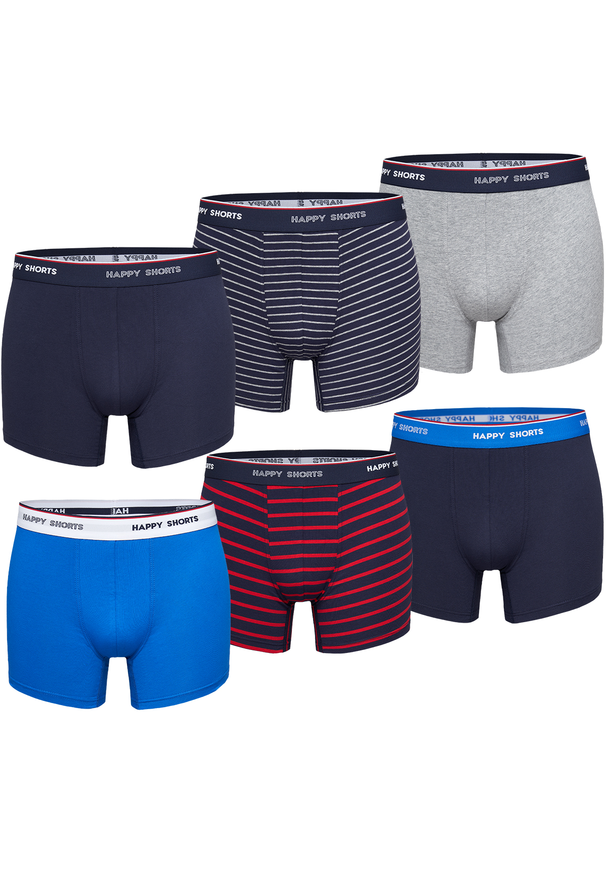 Multipack van 6 Happy Shorts boxershorts. De trunks, boxershorts met korte pijp hebben een elastische waistband en geen naden aan de achterzijde bij het zitvlak. Gemaakt van 95% katoen, 5% elastaan.