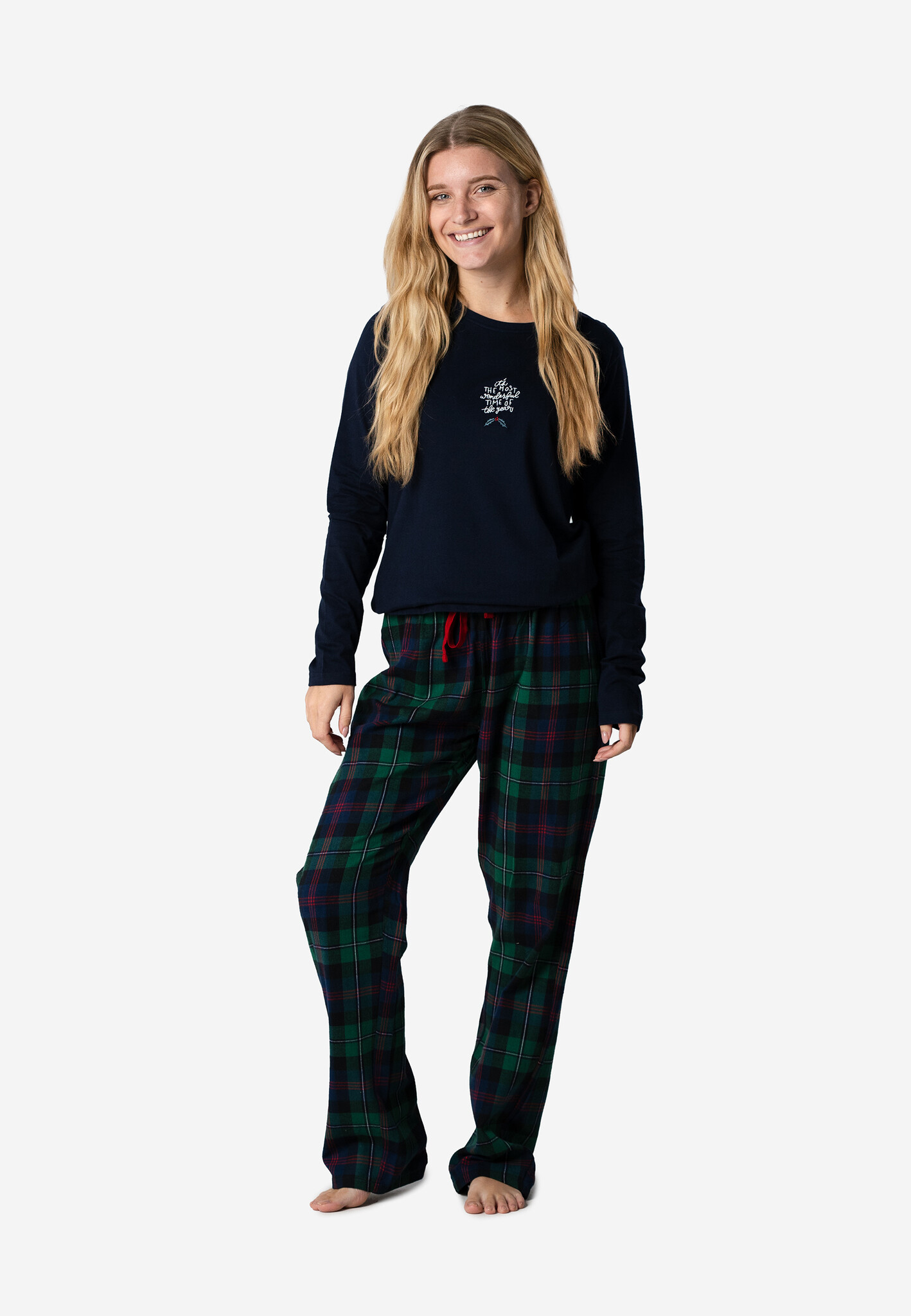De Happy Shorts dames kerstpyjama-set combineert feestelijke flair met comfortabel materiaal, perfect voor gezellige winteravonden. De set bestaat uit een T-shirt met lange mouwen en een ronde hals, gemaakt van zachte single jersey katoen, en een warme, flanellen pyjamabroek met een groen-blauwe ruitprint.