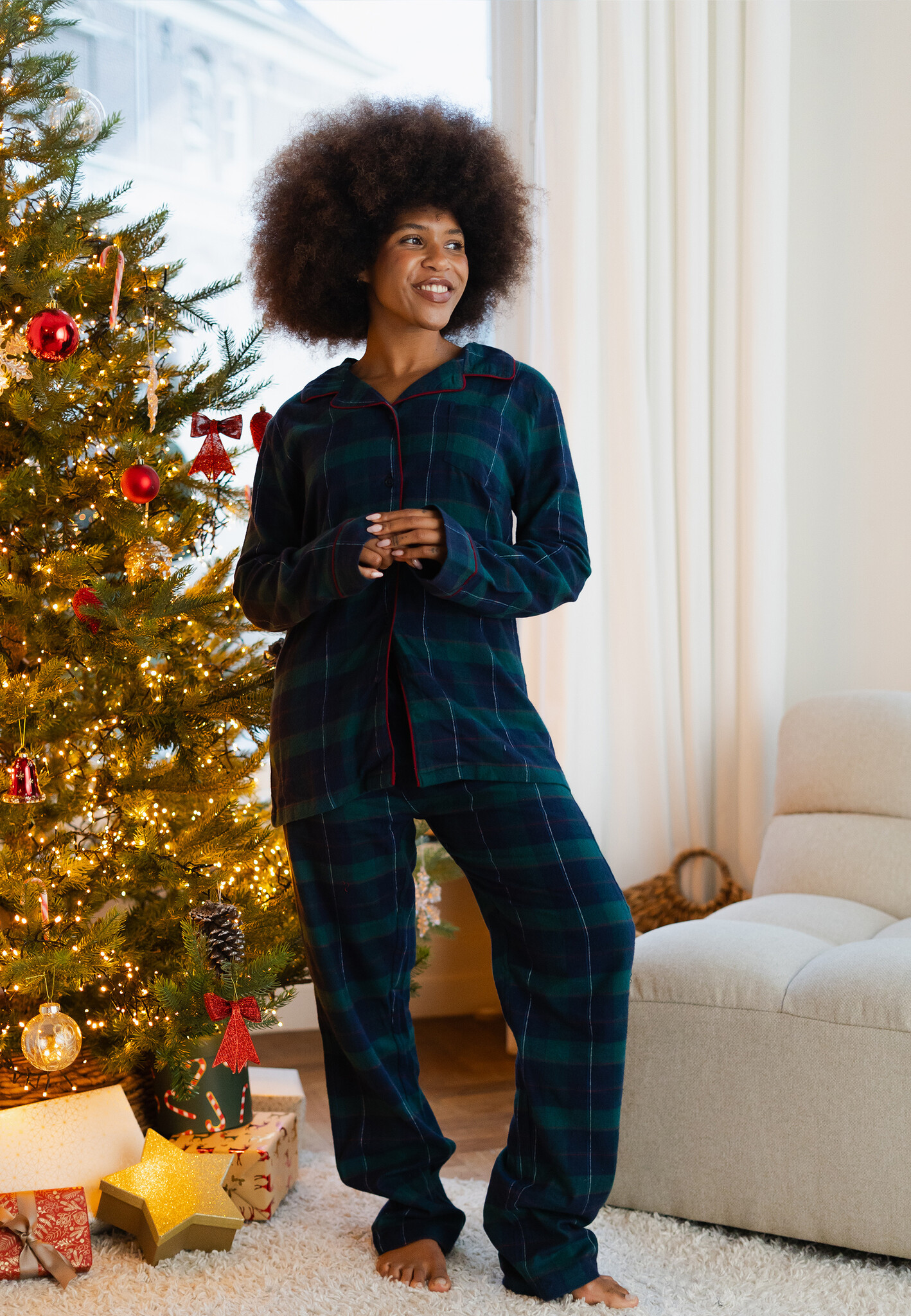 Deze dames kerst pyjama set van Happy Shorts combineert klassieke stijl met ultiem comfort. De set bestaat uit een zacht shirt en een lange broek van geruit flanel, gemaakt van 100% katoen. De warme, ademende stof voelt heerlijk aan tijdens koude winteravonden en zorgt voor een knusse, feestelijke uitstraling — perfect om in te relaxen tijdens de feestdagen.