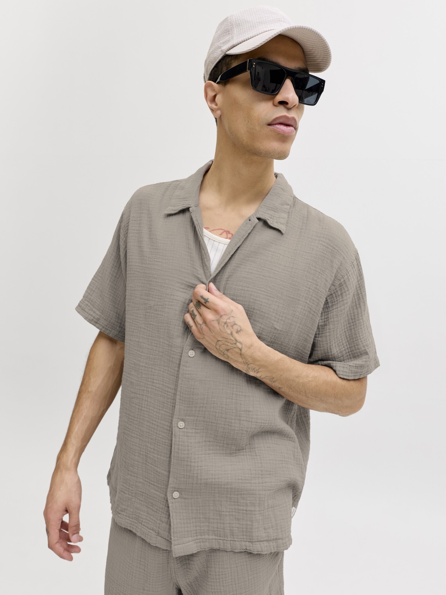 De Jack & Jones JORNANTUCKET set voor heren is een comfortabele en luchtige keuze voor warme dagen. De combinatie van een blouse en shorts in effen taupe zorgt voor een rustige, verzorgde uitstraling die makkelijk past bij een casual outfit. Deze 2-delige set is ideaal voor heren die graag kiezen voor gemak, comfort en een ontspannen look in één.