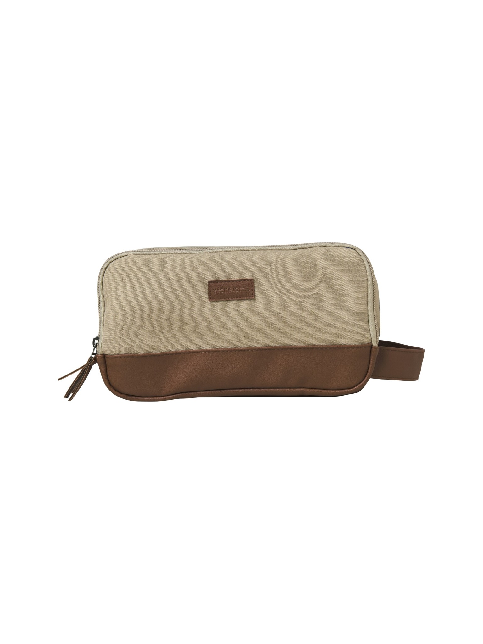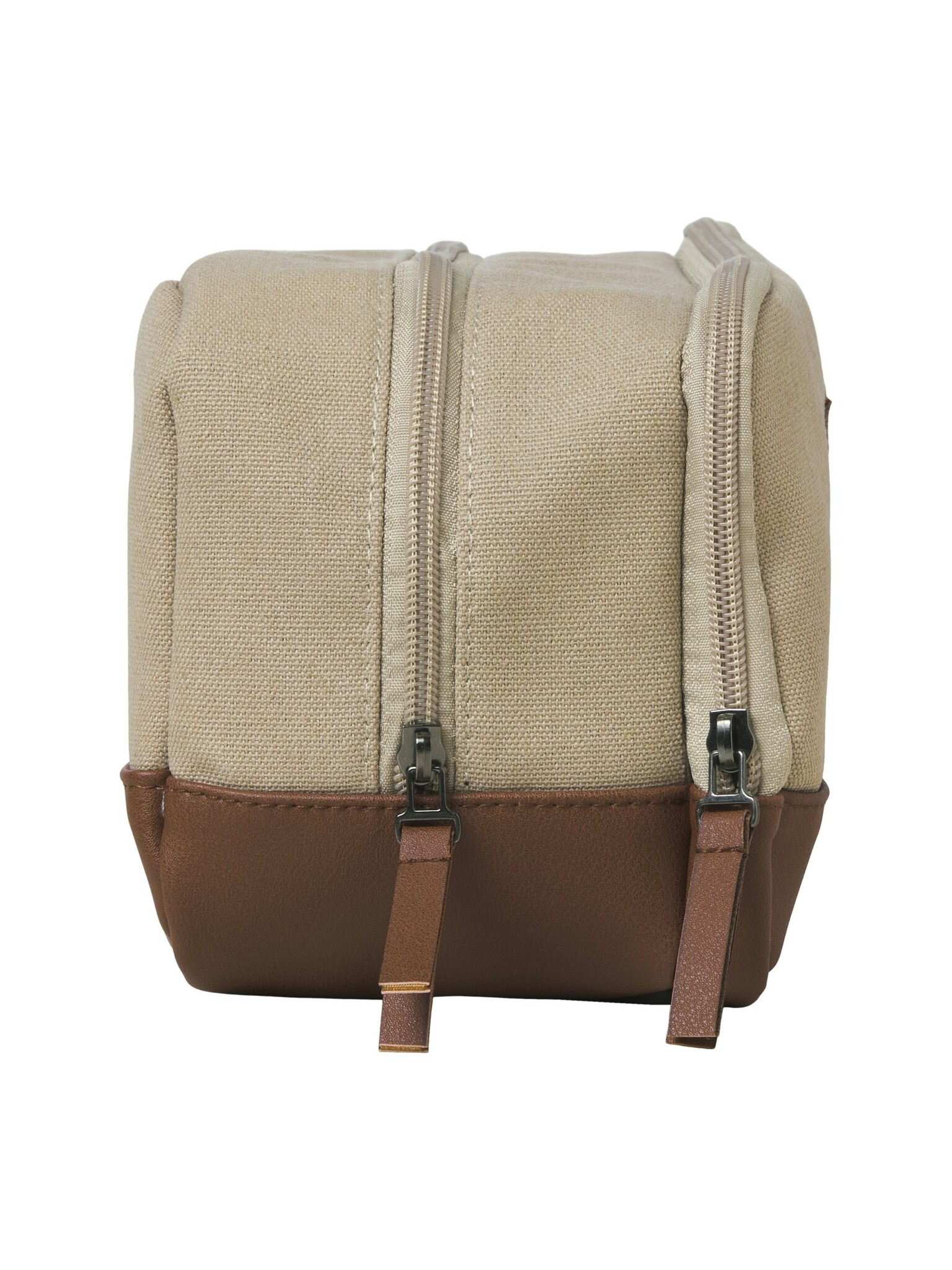 De Jack & Jones heren toilettas JACPASCAL in beige met bruine accenten is een stijlvolle en functionele oplossing voor het opbergen van je verzorgingsproducten. Gemaakt van stevig canvas met gerecyclede materialen, is deze toilettas ideaal voor gebruik thuis of onderweg.