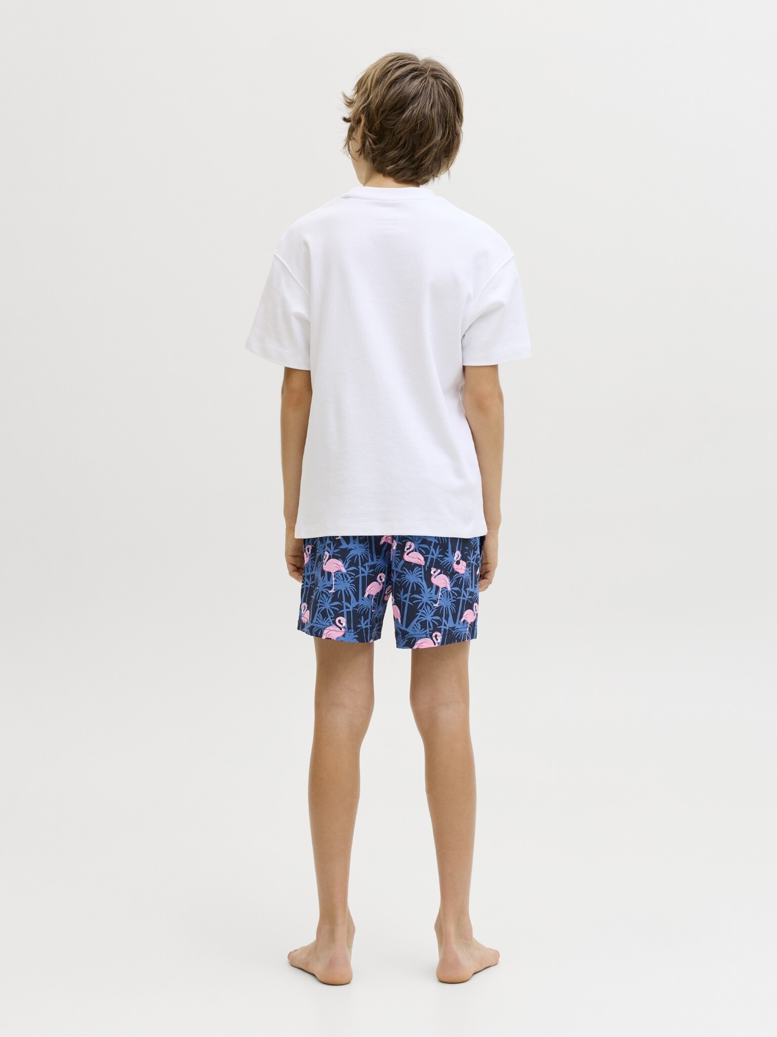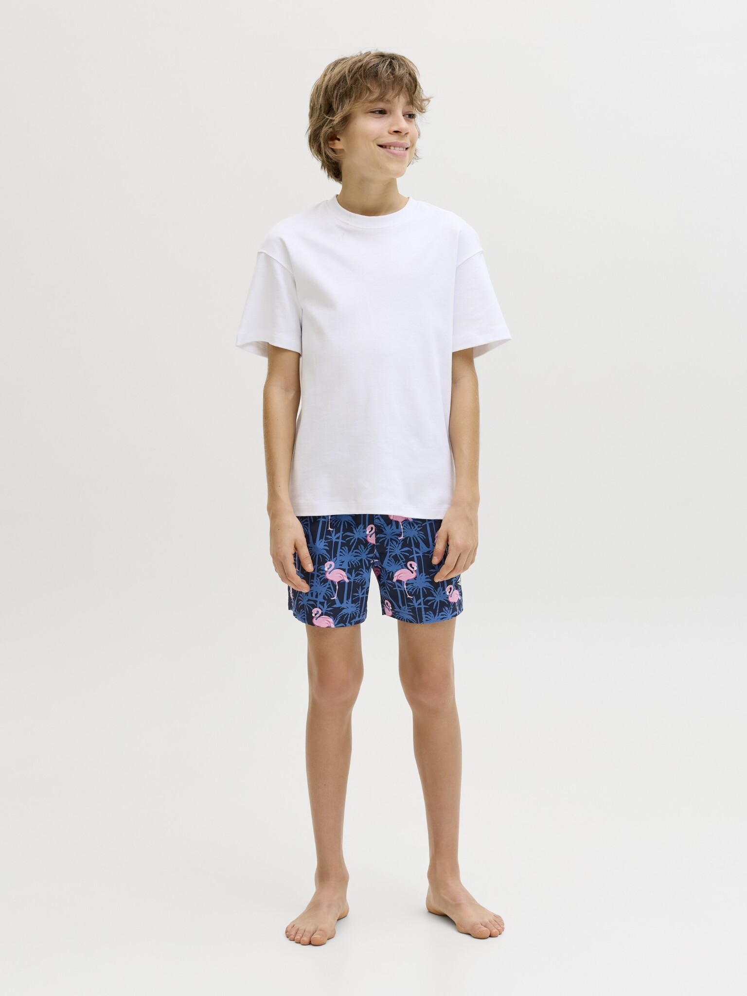De donkerblauwe zwemshort van Jack & Jones Junior is een vrolijke en comfortabele keuze voor jongens die graag goed voor de dag komen op het strand of bij het zwembad. De JPSTMAUI VIBES valt op door de speelse flamingo- en palmprint, waardoor deze jongens zwemshort meteen een zomerse uitstraling krijgt. Dit model is ideaal voor vakantie, zwemmen en actieve dagen aan het water.