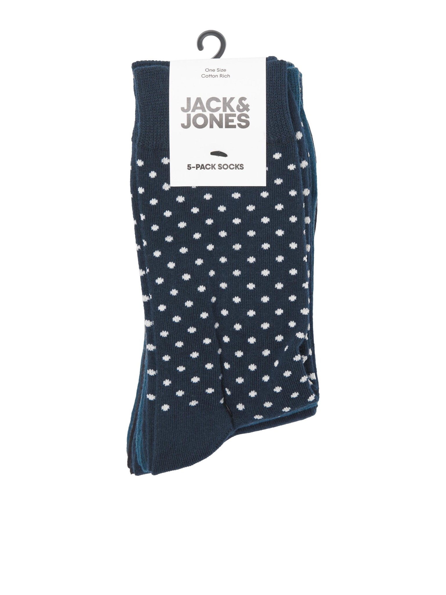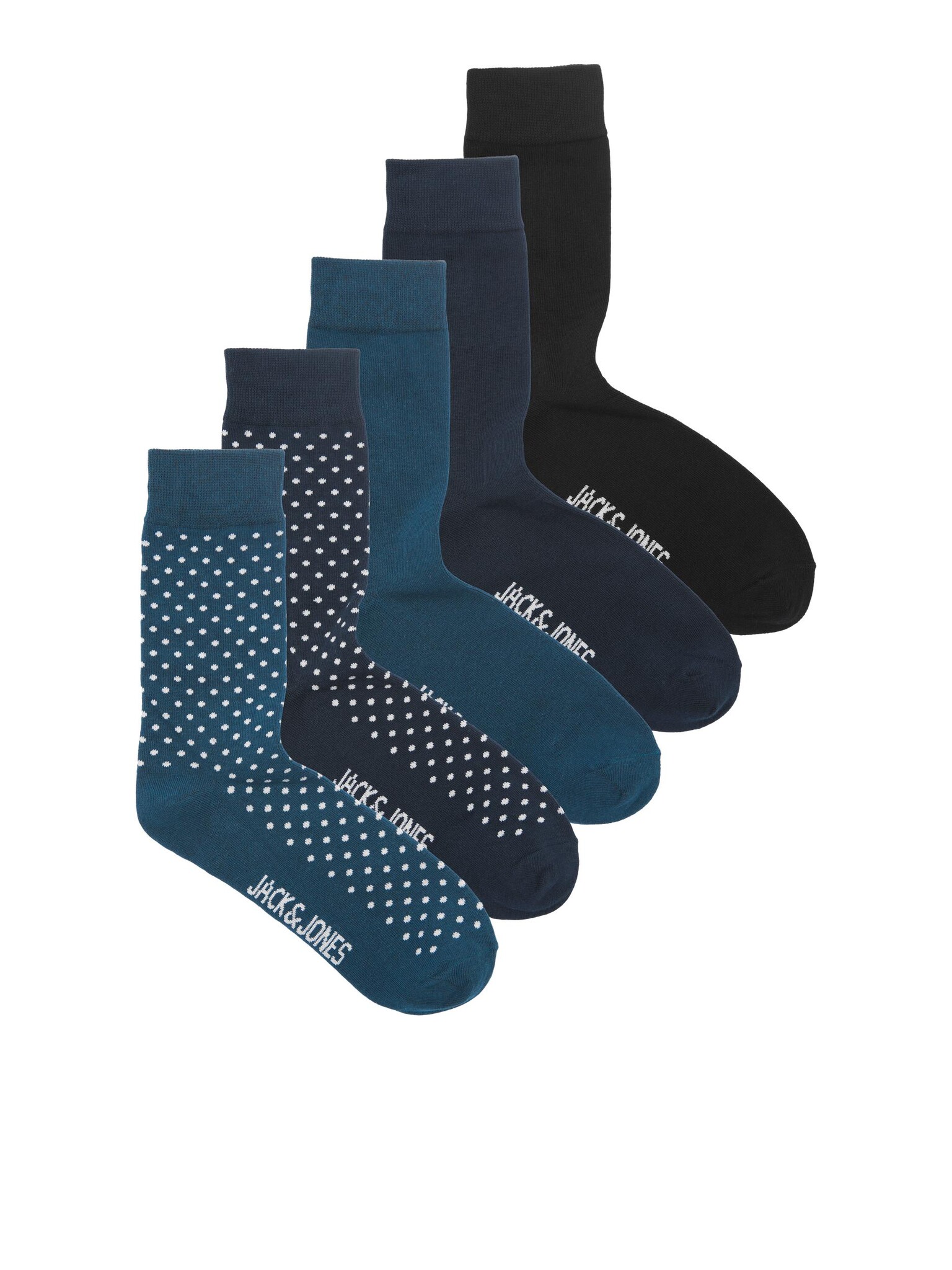 Multipack van 5 paar Jack and Jones heren sokken. Bundel bevat zwarte en navy blauwe sokken met stippen print. Deze sokken hebben een optimale pasvorm bij schoenmaat 42-44. Gemaakt van 72% katoen, 26% polyester, 2% elastaan.
