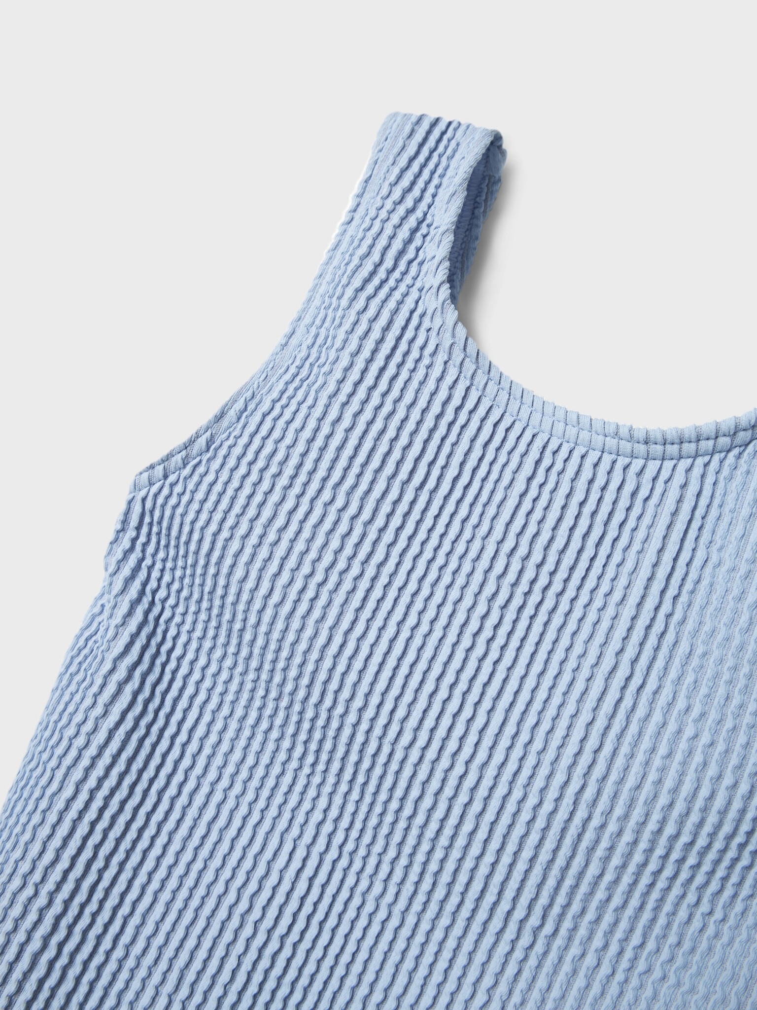 Het NKFZIBA badpak biedt de perfecte combinatie van stijl en comfort voor zonnige dagen aan het water. Het ribtricotmateriaal zorgt voor een trendy, gestreepte look met precies de juiste elasticiteit voor een fijne pasvorm. Dankzij de polyester mesh voering blijft het badpak ondoorzichtig, zodat je kind zich altijd prettig voelt.
