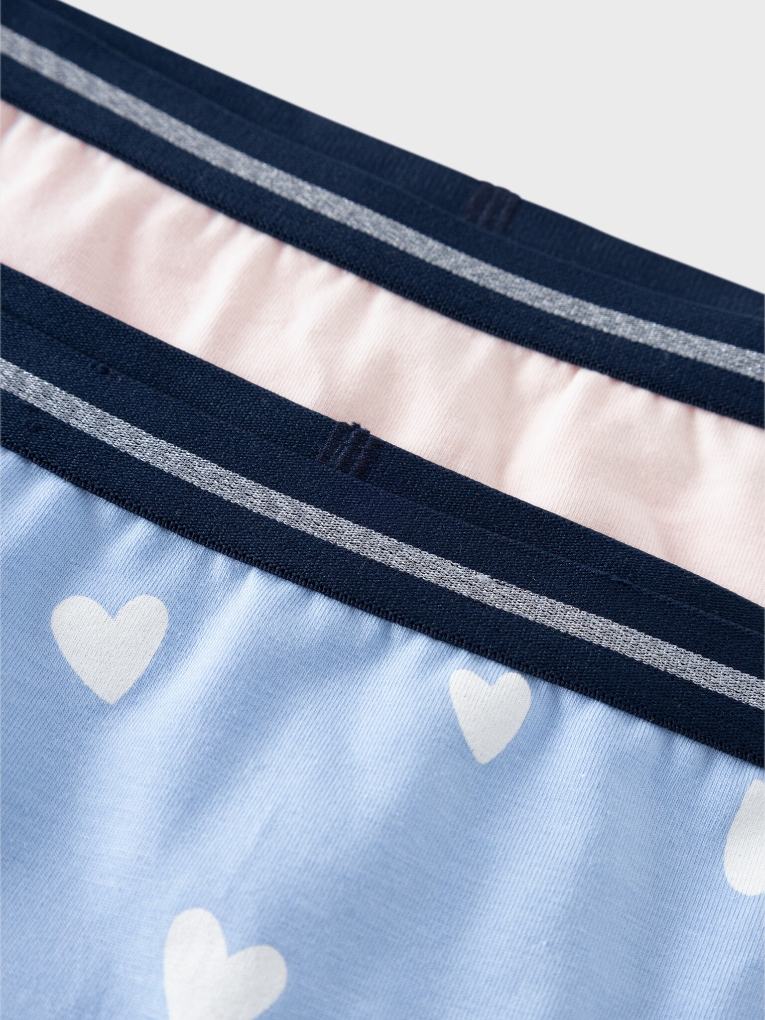 Dit 2-pack bestaat uit één leuke blauwe hipster met gave hartjesprint en één effen lichtroze. In de elastische taileband zitten leuke glitters verwerkt. De hipsters zijn gemaakt van 95% jersey katoen en 5% elastaan, jersey is een lichte, rekbare stof met een zacht oppervlak aan de buiten en binnenkant voor een comfortabel gevoel en bewegingsvrijheid.