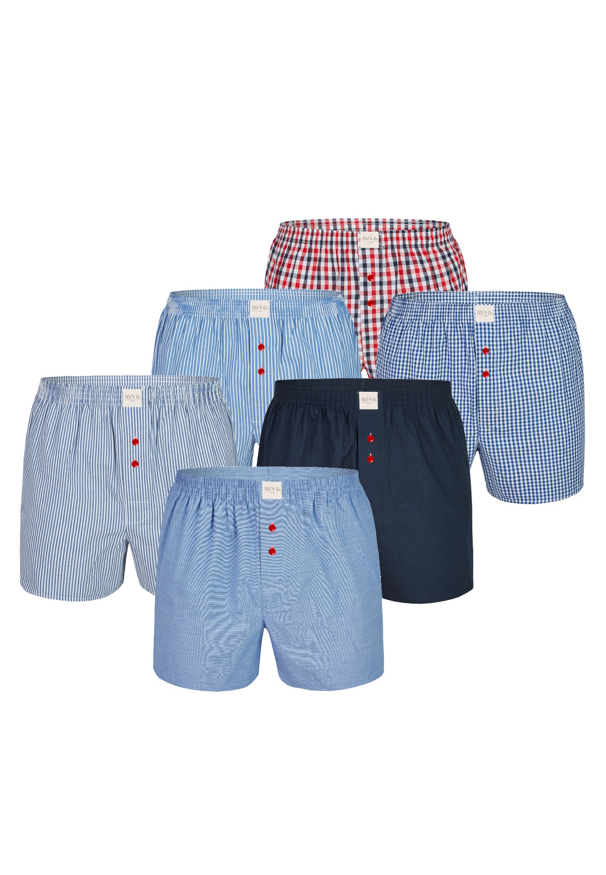 De set bevat zes boxershorts in zes klassieke verschillende designs, variatie van geruit en geblokt.