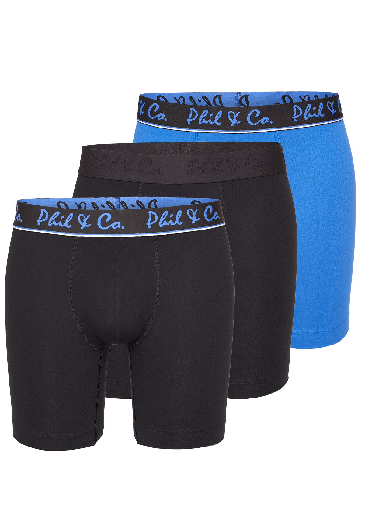 Phil & Co zwarte en blauwe heren boxershorts met lange pijpjes. Deze set bevat 3 effen boxer briefs met elastische waistband. De extra lange pijpjes sluiten goed aan op de benen en geven extra draagcomfort.
