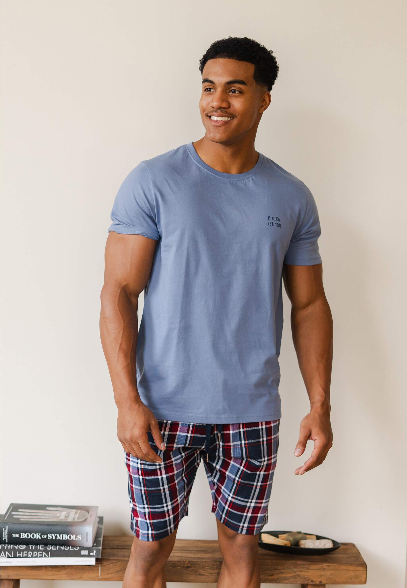 De Phil & Co Essential shortama heren korte pyjama set blauw/geruit is een luchtige set voor warme nachten en relaxte ochtenden. Het lichtblauwe t shirt met korte mouwen voelt zacht aan en de geruite korte broek geeft de set een klassieke, frisse look. Deze shortama zit prettig om in te slapen maar ook om thuis comfortabel rond te lopen.