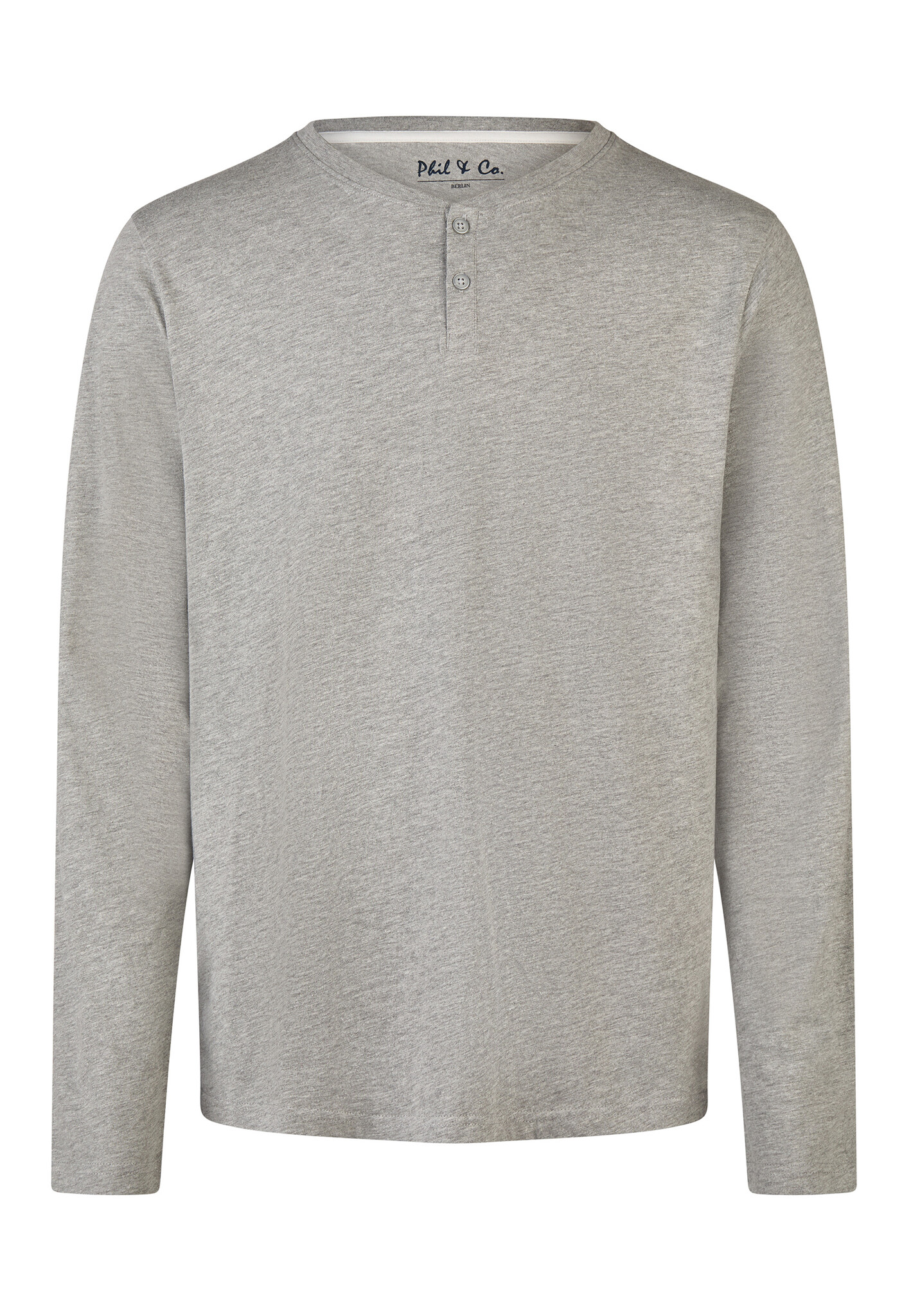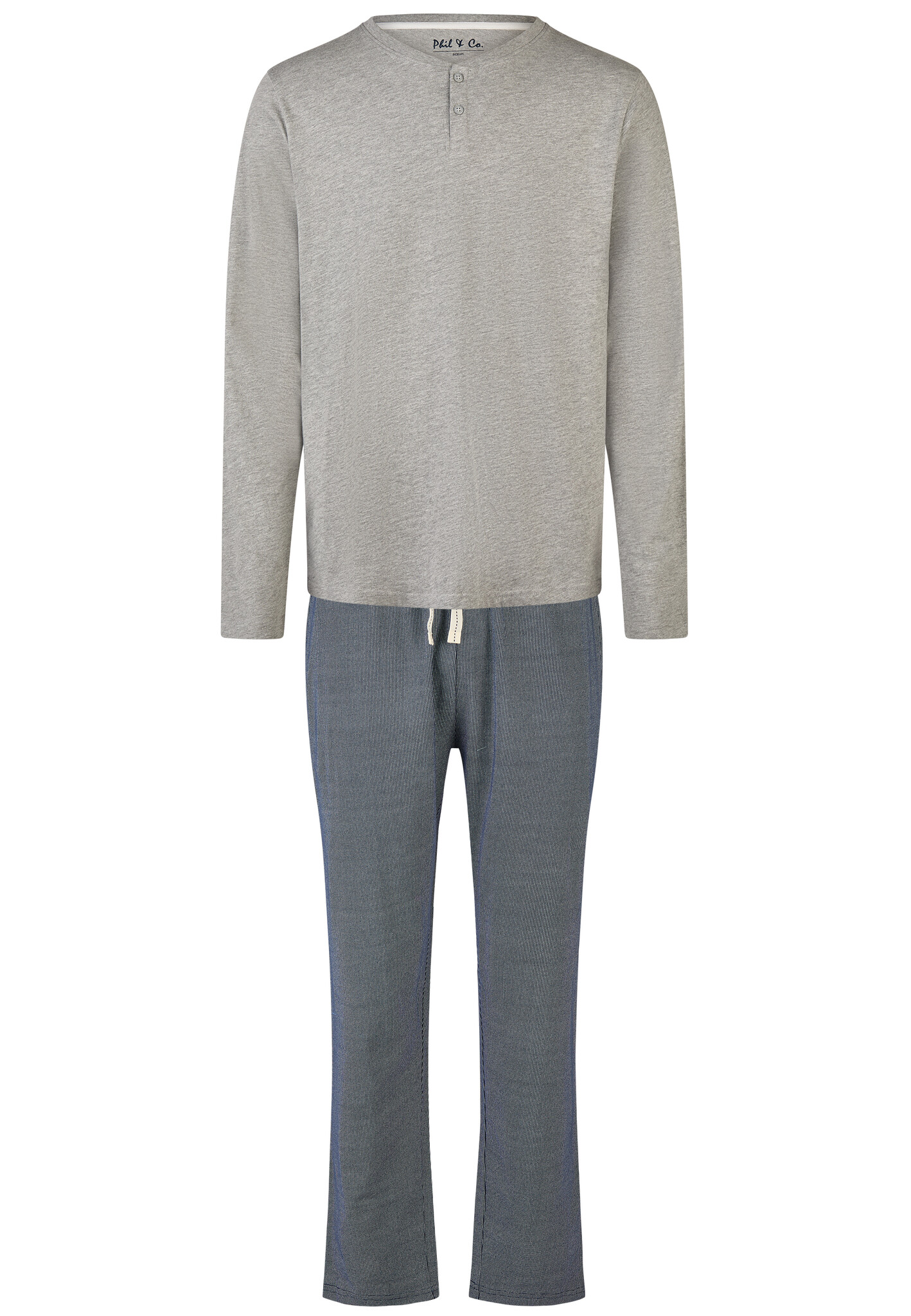 - De pyjamaset van Phil & Co bestaat uit een longsleeve T-shirt met knoopjes bij de hals