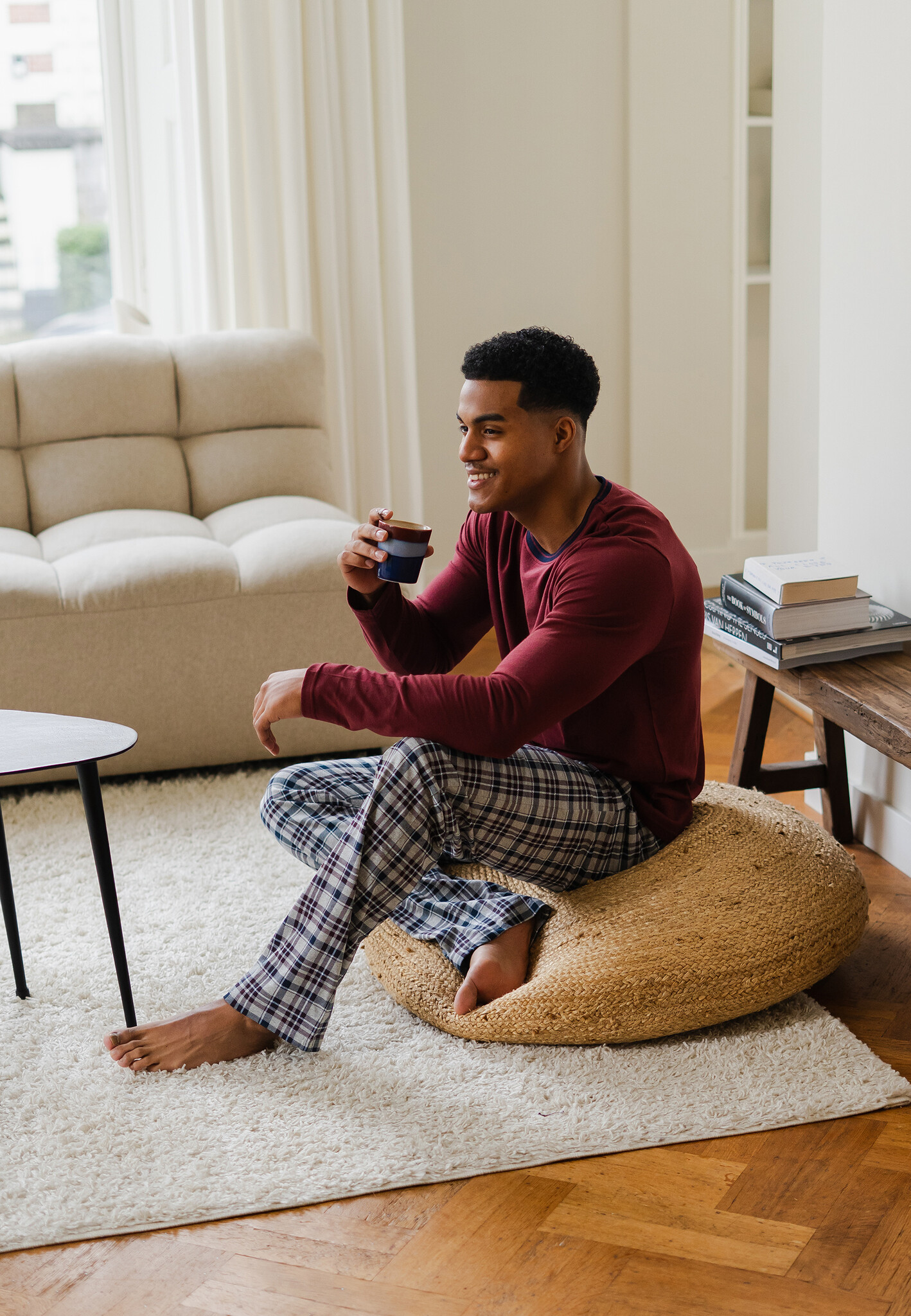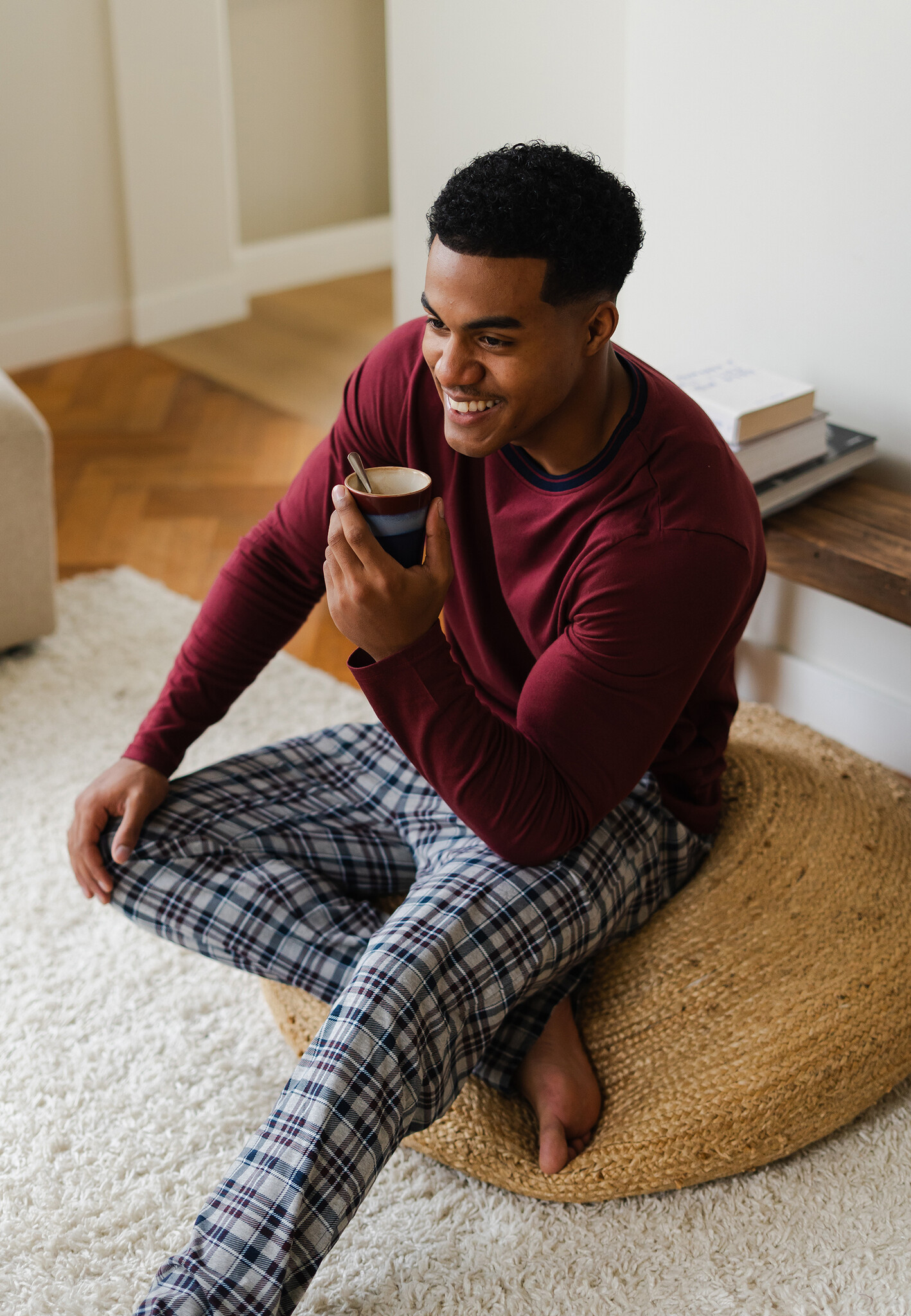 - Bijzondere kenmerken: de grijs geruite broek wordt gecombineerd met een rood shirt met een subtiele print op de borst, wat zorgt voor een warme en tijdloze winteruitstraling.